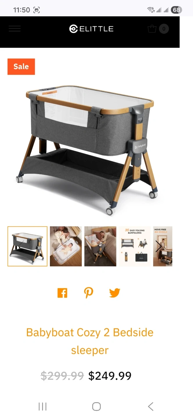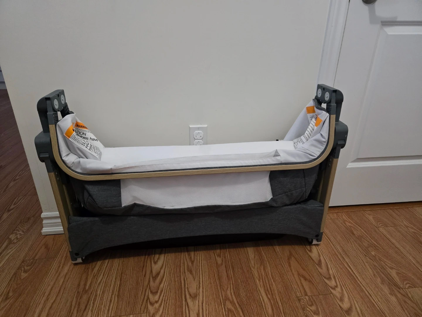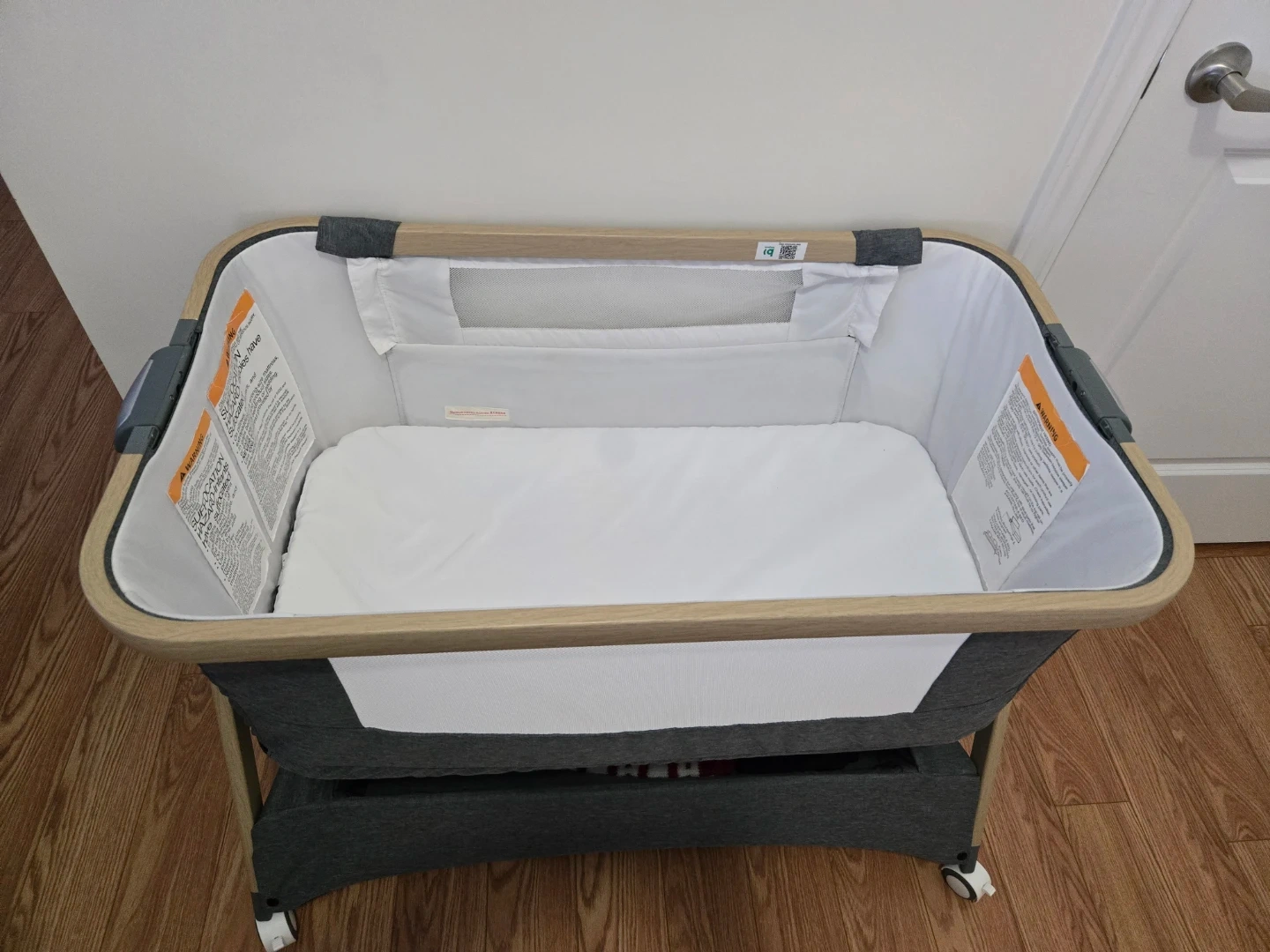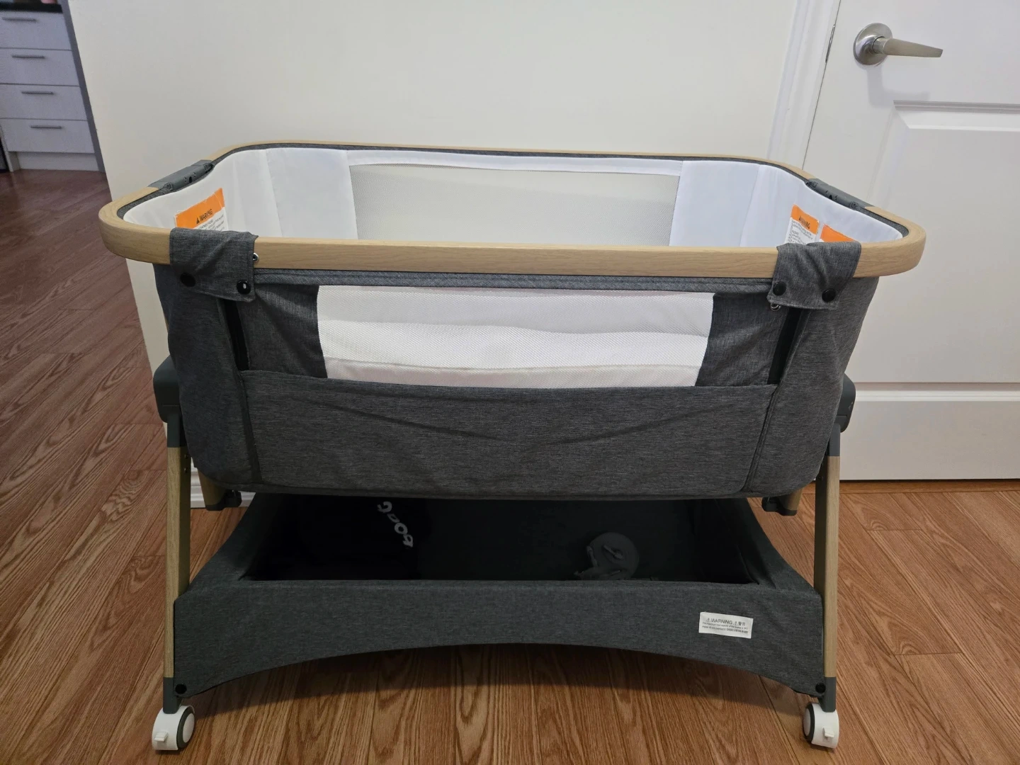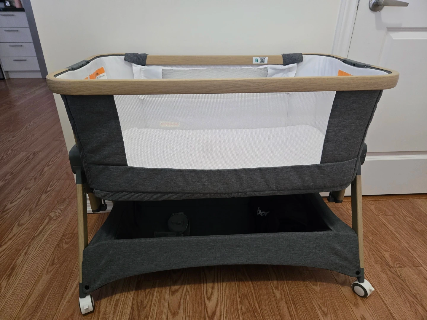 This is a Babyboat bedside bassinet with a grey fabric exterior and wooden accents. It features mesh sides for ventilation and a lower storage basket. It has wheels for easy mobility.