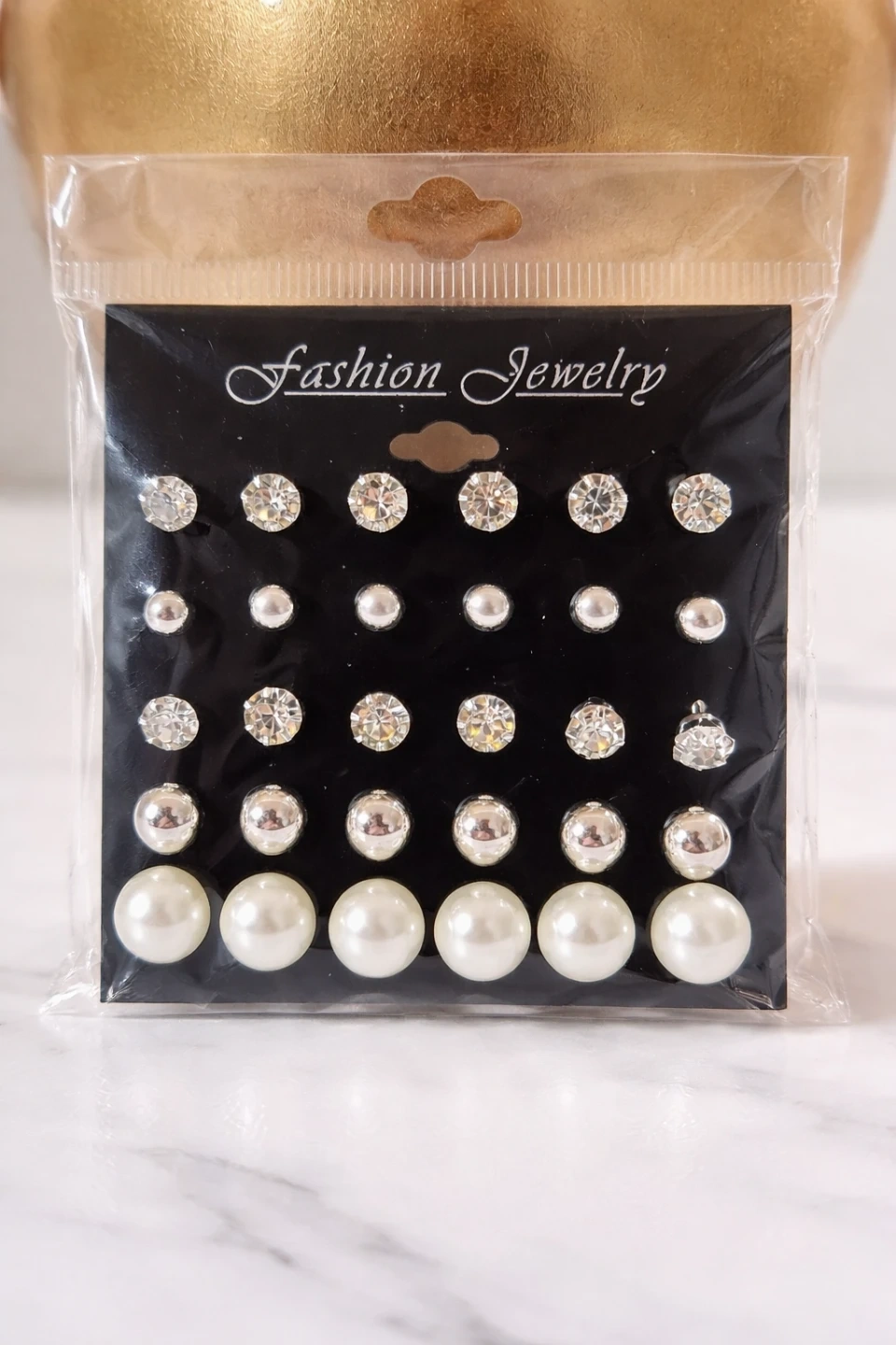 This set includes 24 pairs of stud earrings in various styles. You'll find sparkly rhinestones, faux pearls, and silver-tone ball designs. These earrings come packaged and ready to wear.