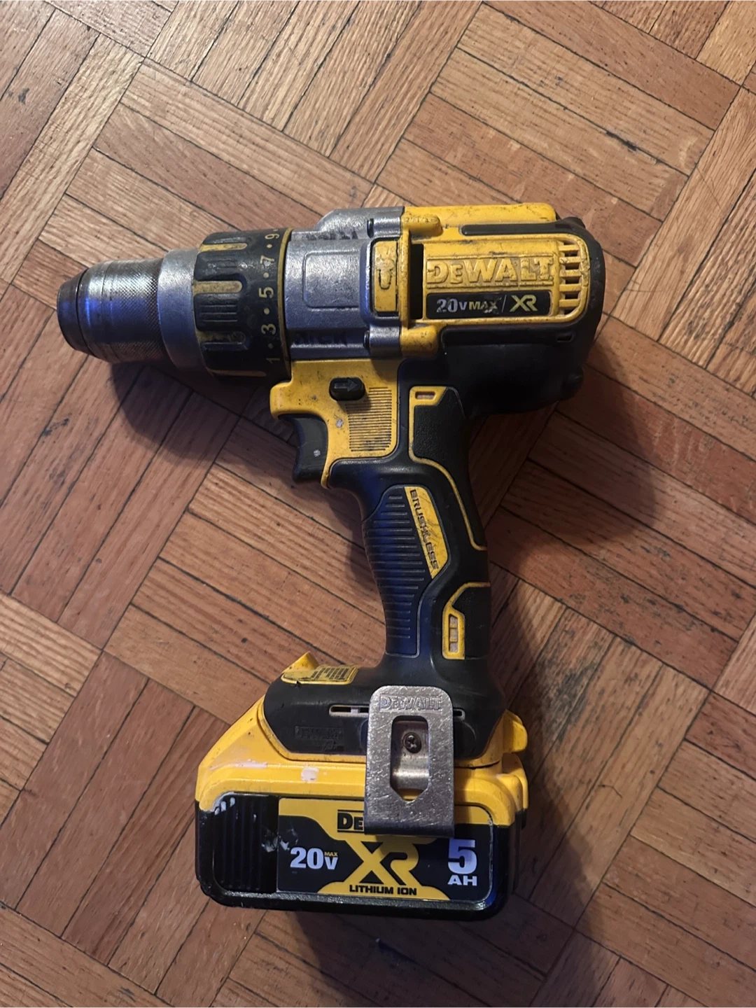 DeWalt 20V MAX XR cordless drill with a 5 Ah lithium ion battery. It's a brushed hammer drill with a brushless motor. Includes a metal chuck for secure bit grip.
