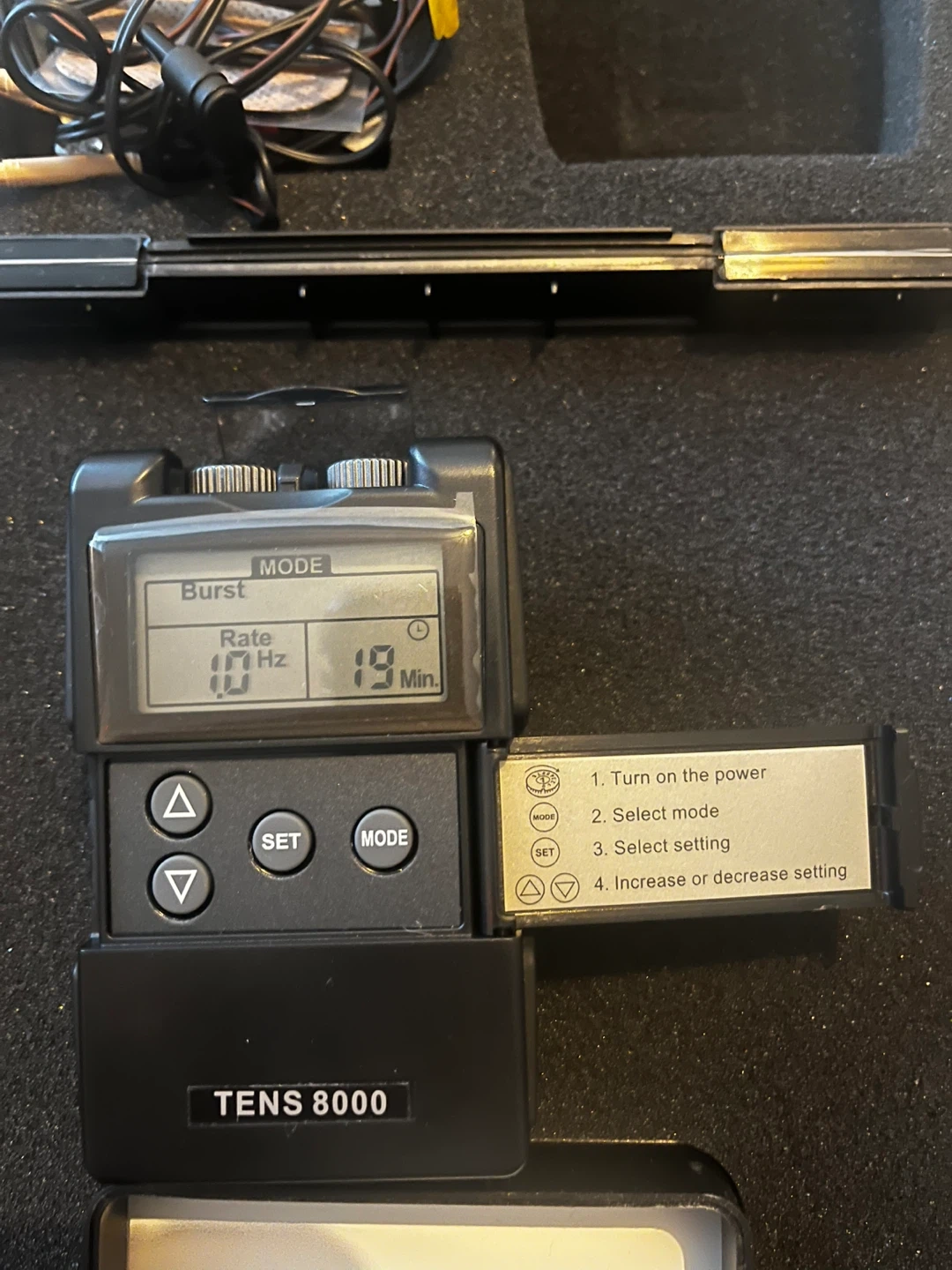 This TENS 8000 unit comes with its original carrying case, wires, and pads. It's designed for personal pain relief. The unit has multiple modes and settings that can be adjusted.
