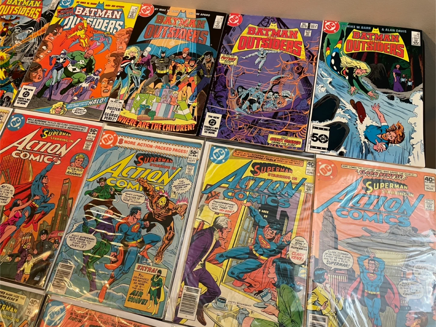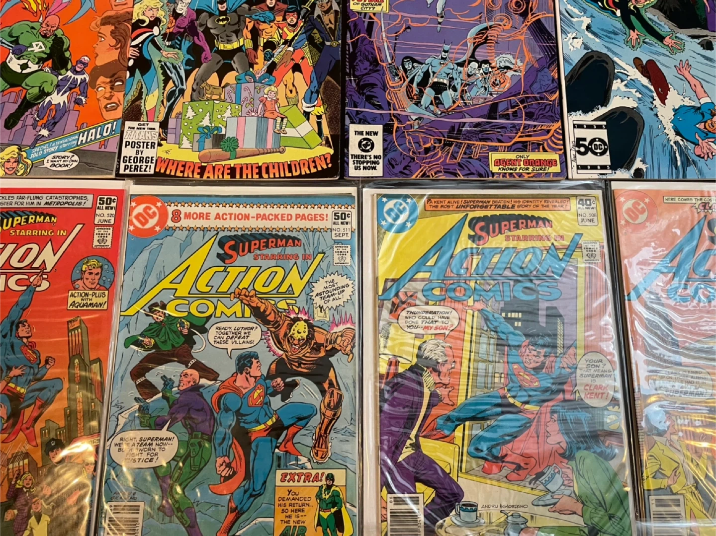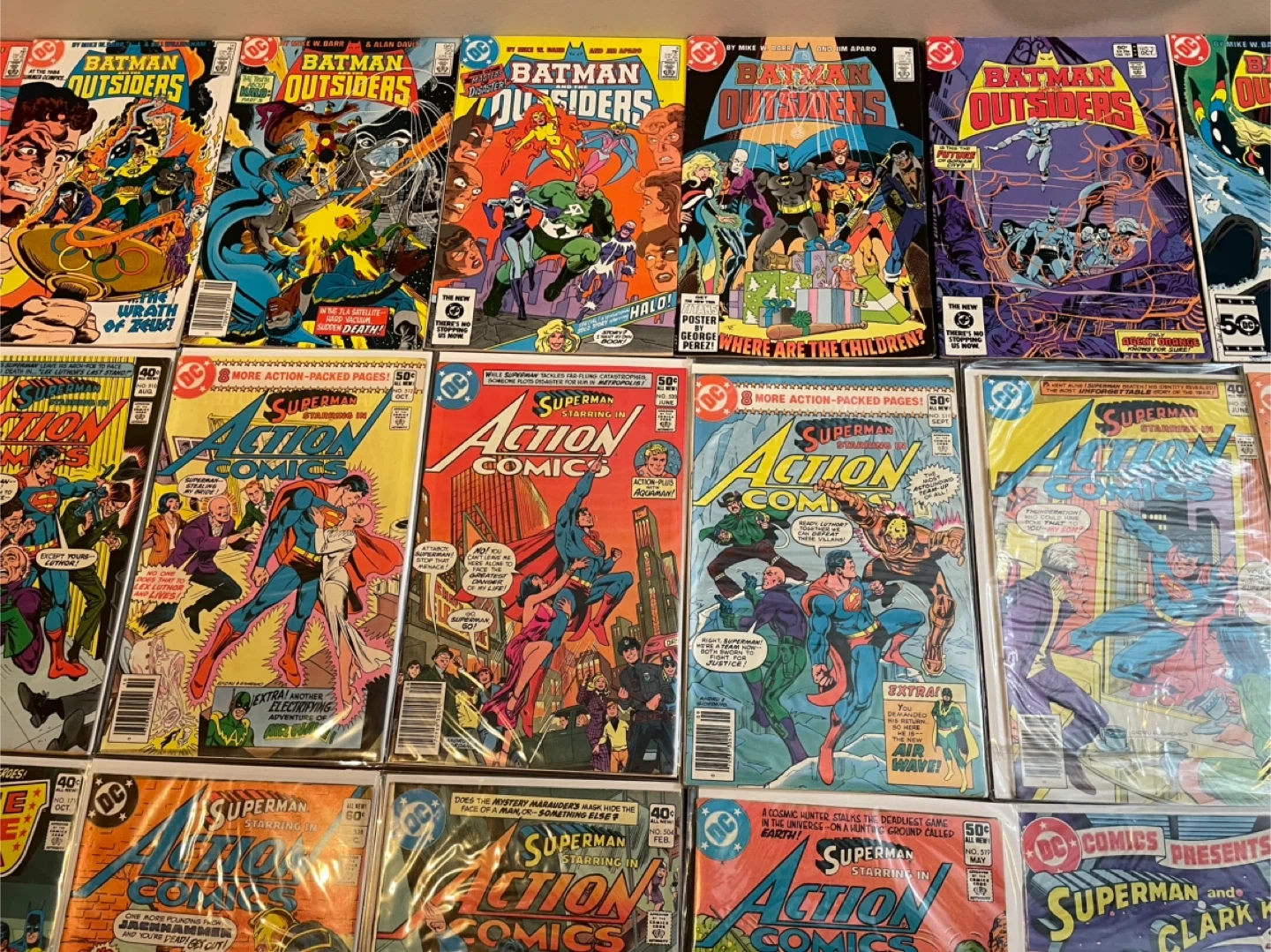 This collection includes various issues of DC Comics titles, featuring Batman and Superman. Many are bagged for protection. Great for any comic collector! 50$