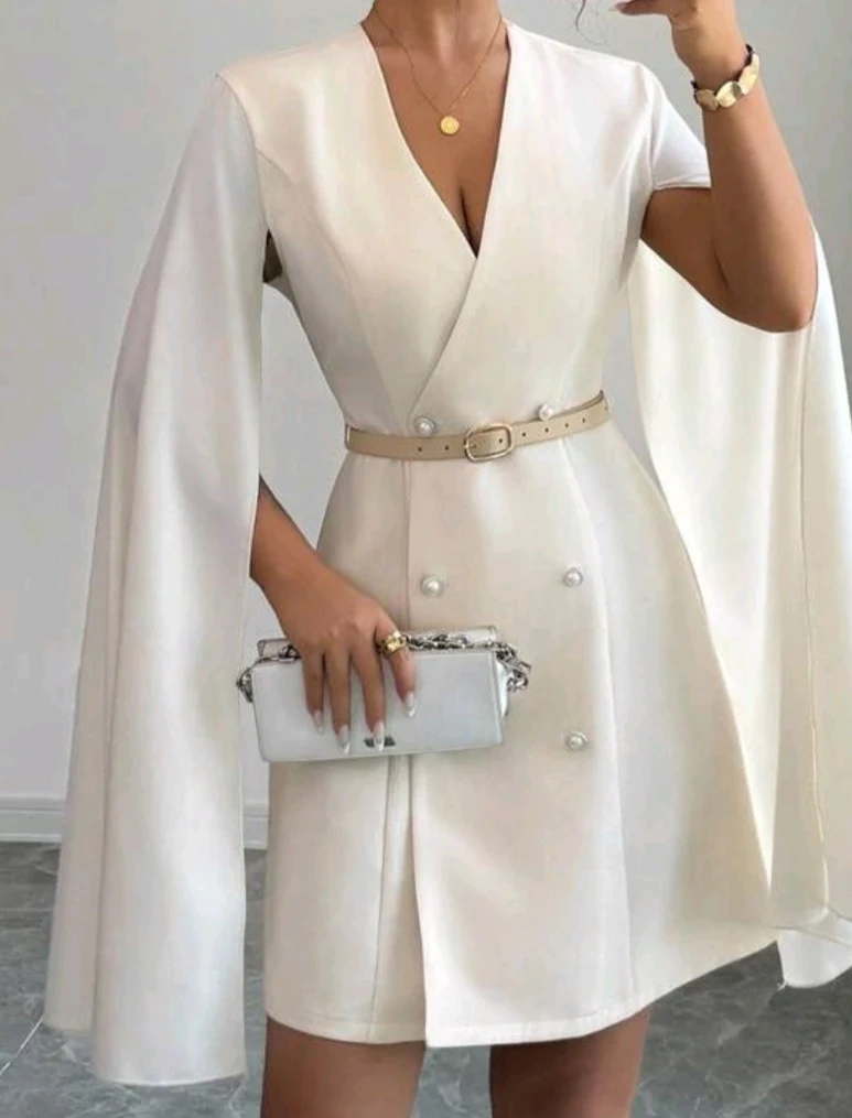 A stylish white dress featuring dramatic cape sleeves and a double-breasted front.