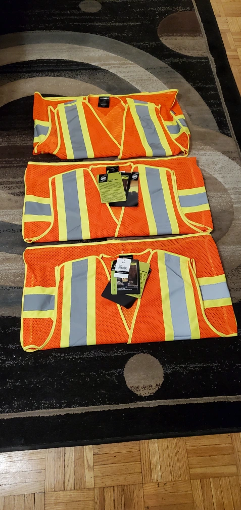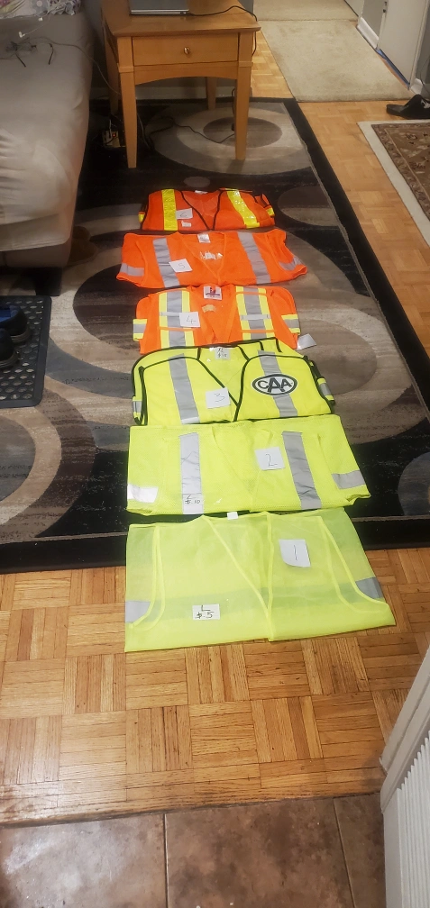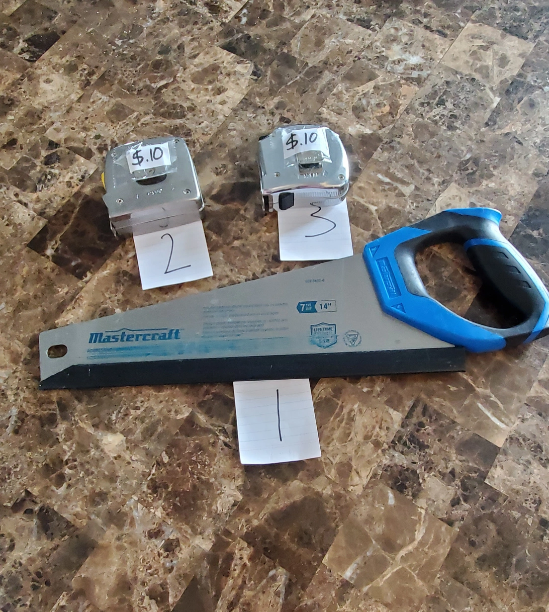 Mastercraft hand saw, two tape measures, three orange safety vests, and one lime green safety vest. Vests appear new,.