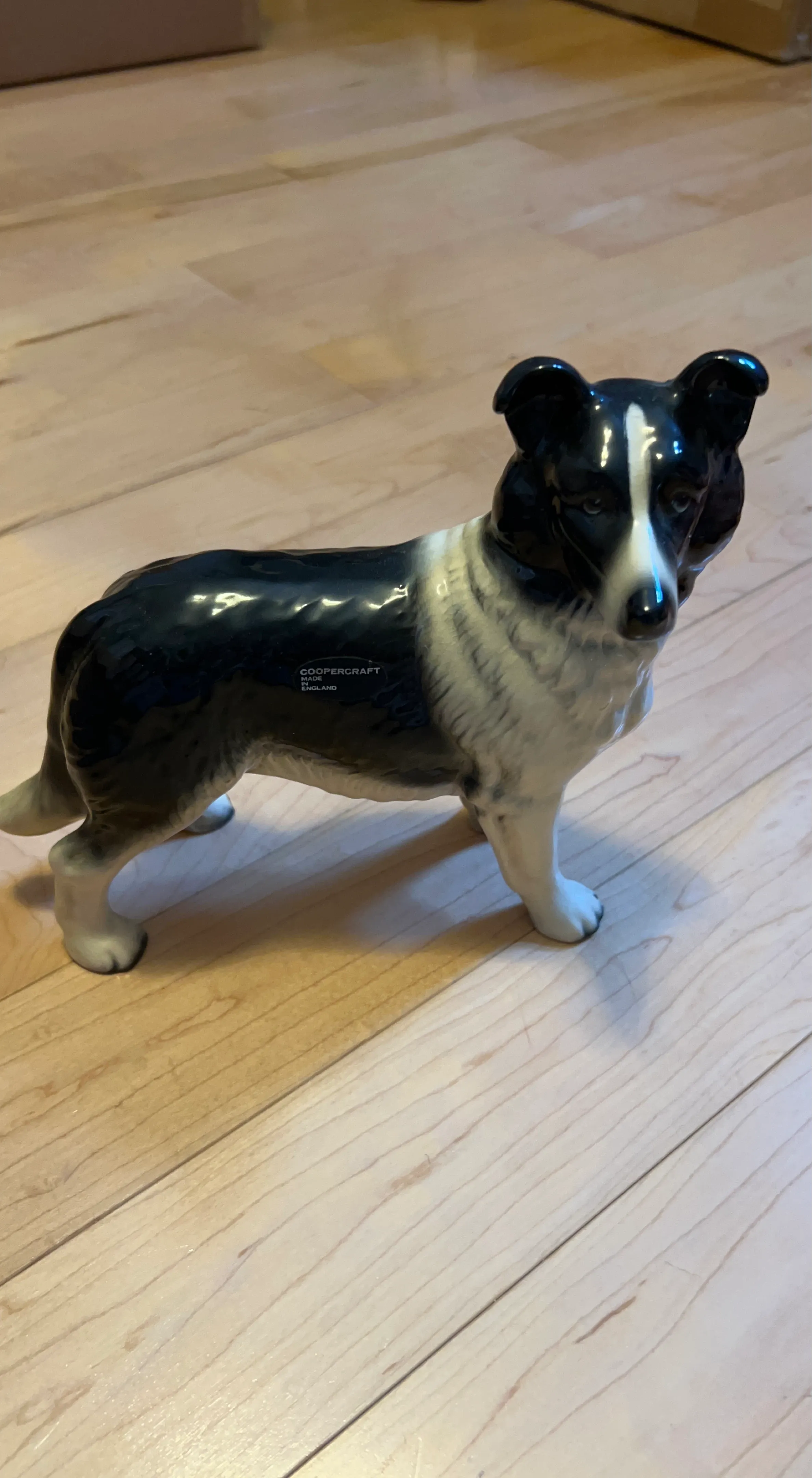 A black and white Coopercraft Collie dog figurine. It's made of ceramic and was manufactured in England. This decorative piece would suit any dog lover's display!