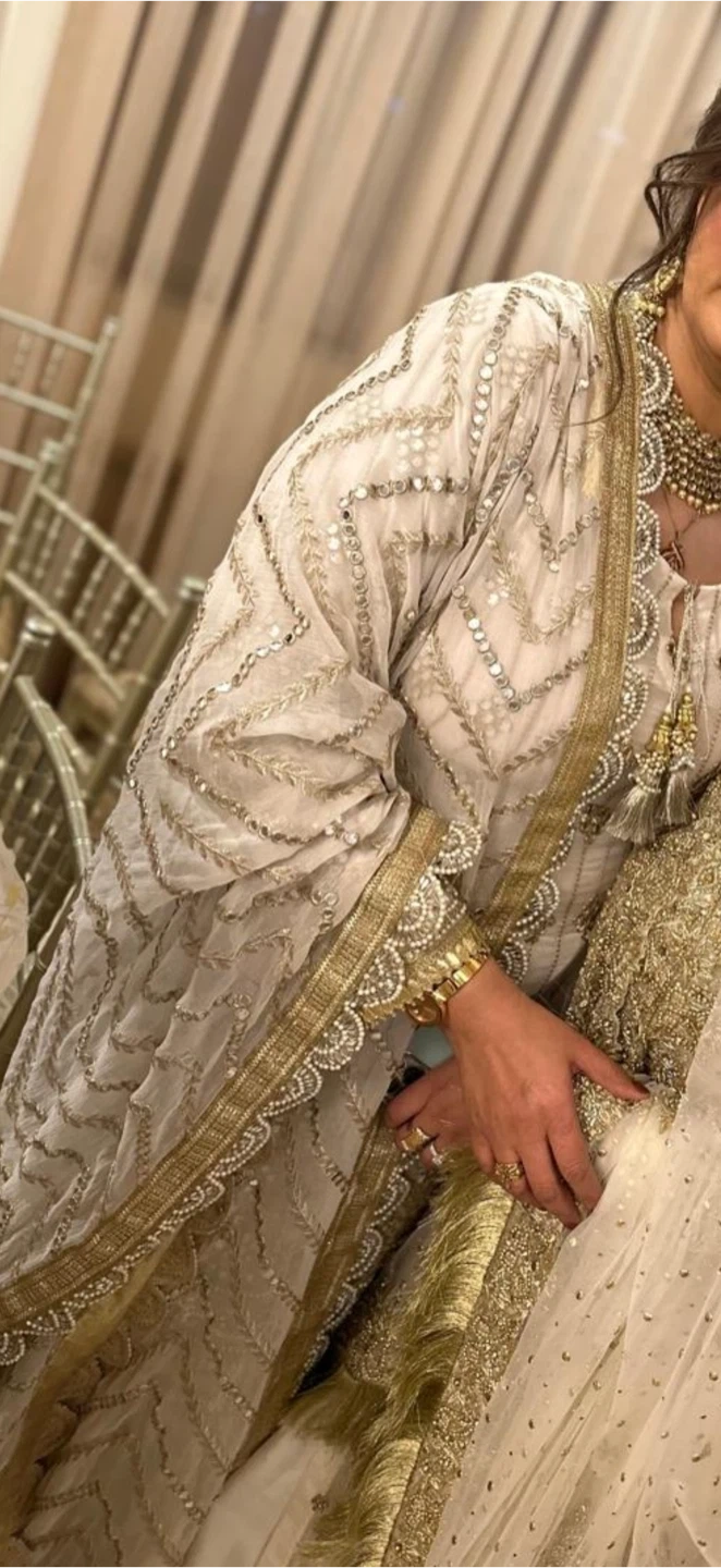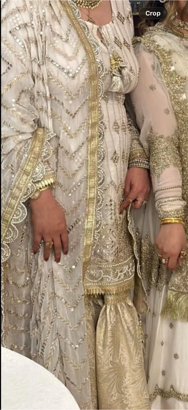 Beautifully detailed kameez with intricate gold embroidery and mirror work. Comes with a matching dupatta and jamavar ggarara . This outfit is perfect for special occasions like weddings or parties. Worn only one hour size fit to large nd xl