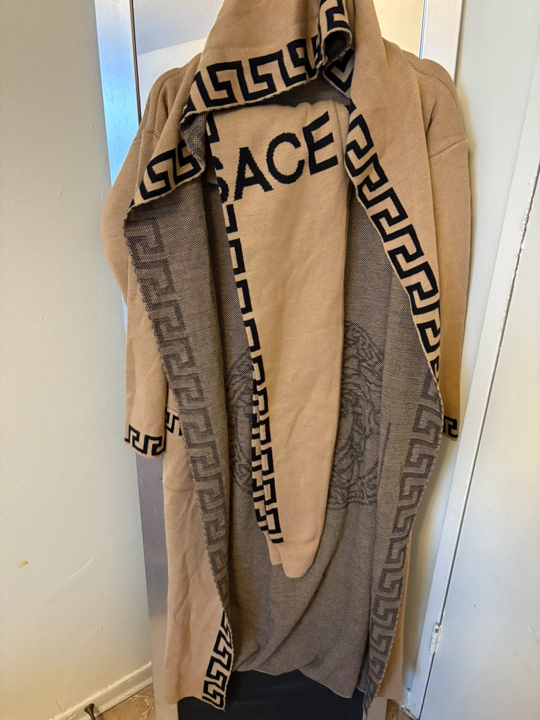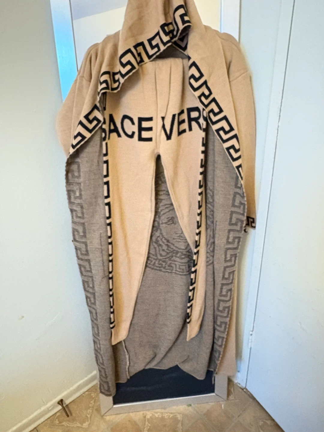 This stylish beige knit set features the iconic Versace Greek key pattern and Medusa head logo. It includes a long robe with a hood and matching pants. Made from a comfortable knit material.