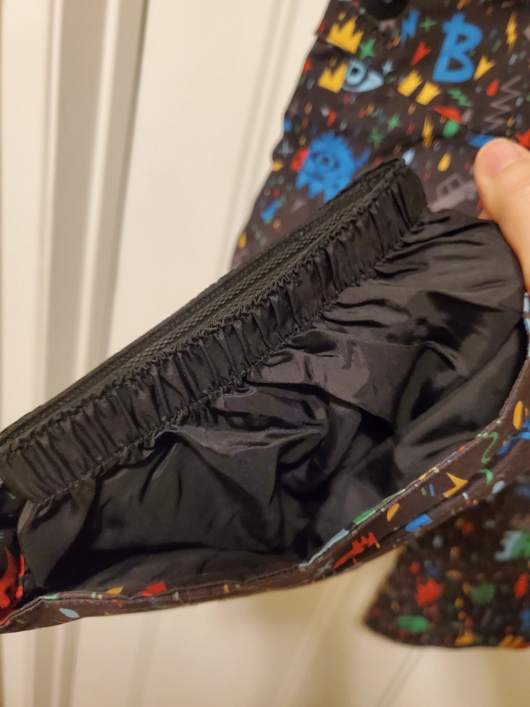 Features adjustable suspenders and elastic cuffs. Fun monster print.