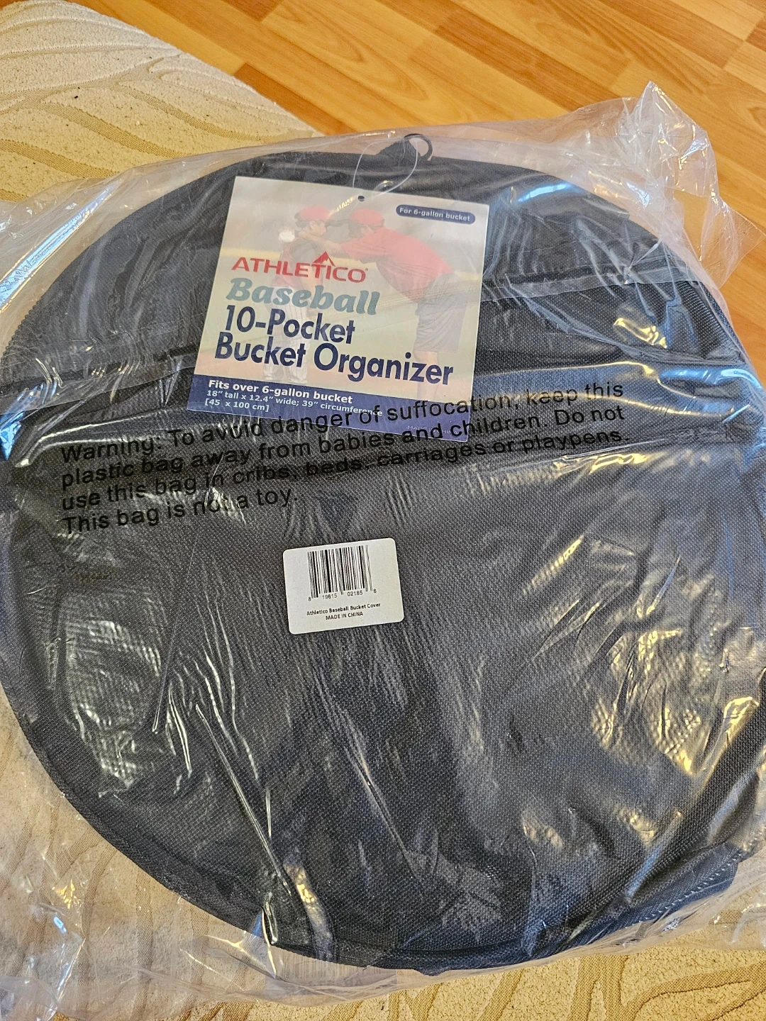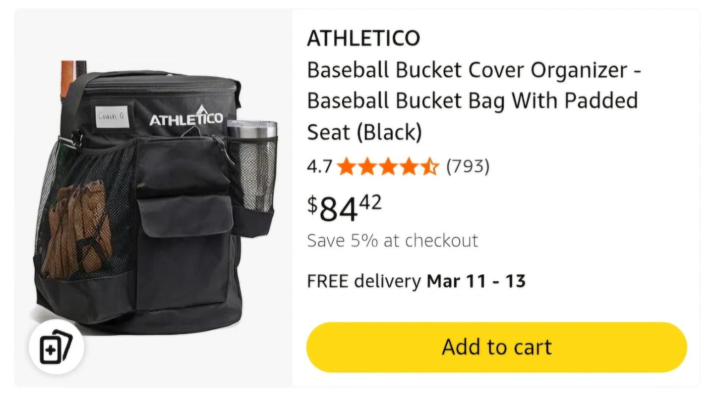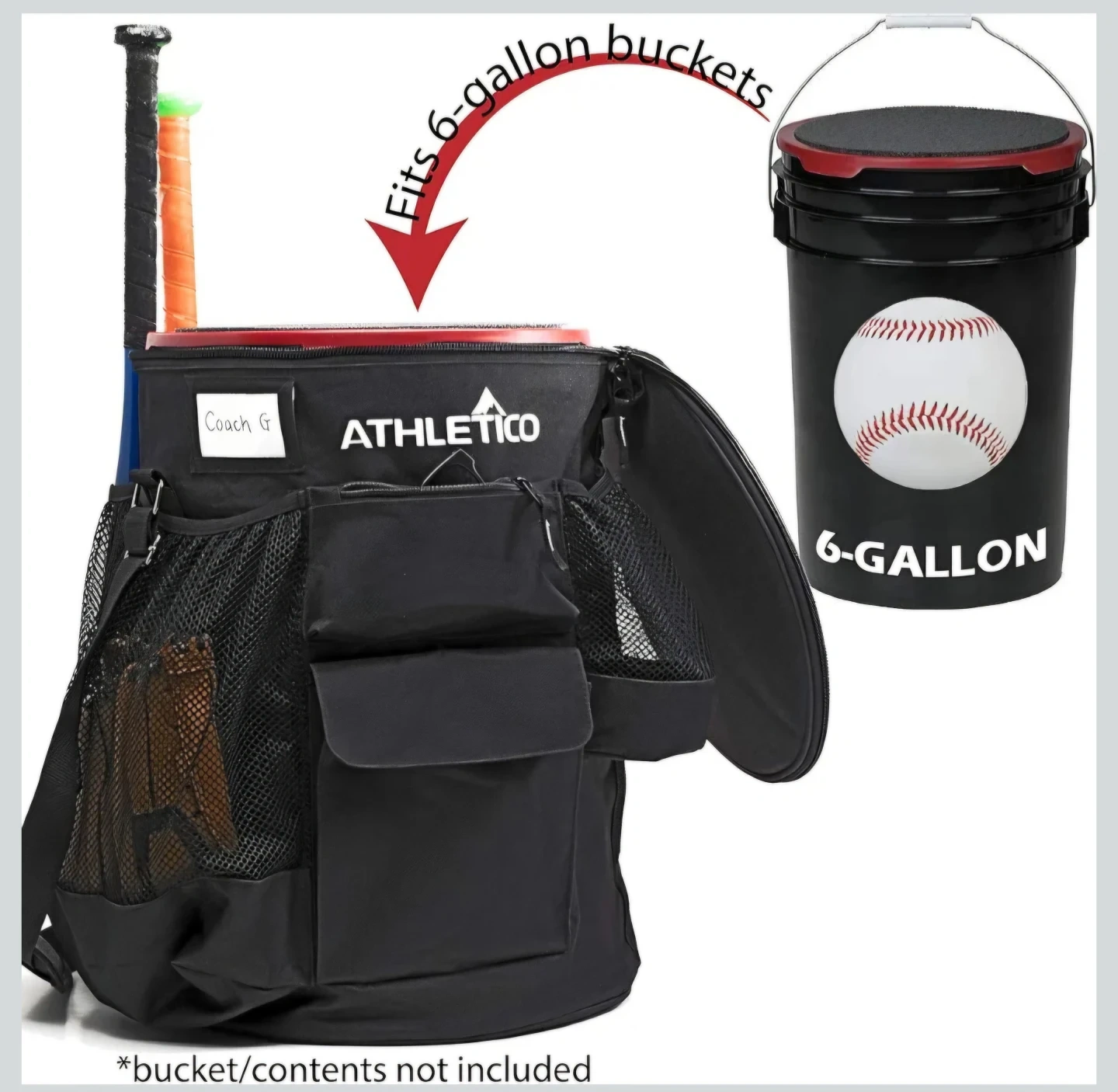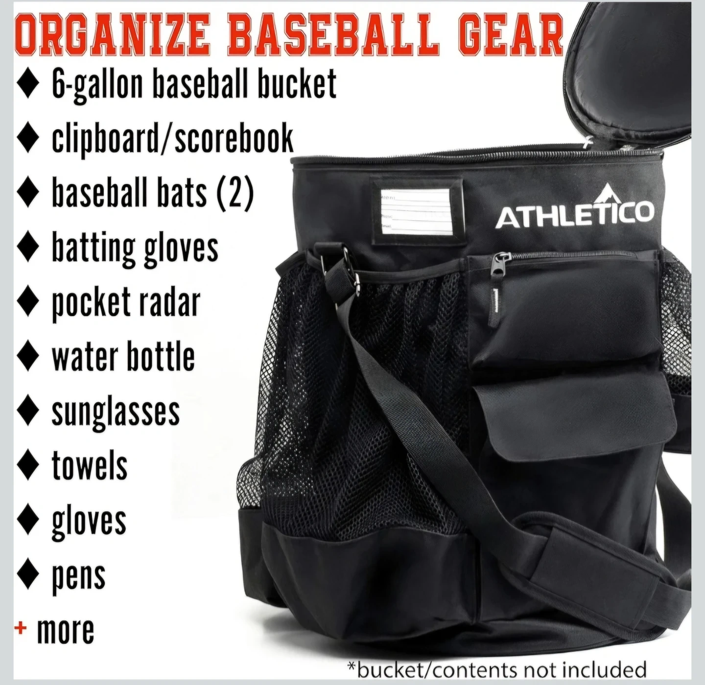This Athletico baseball bucket organizer fits over a 6-gallon bucket and provides 10 pockets for gear. It's made of durable black fabric and includes mesh pockets for water bottles and bats. It helps keep baseball equipment tidy and accessible!