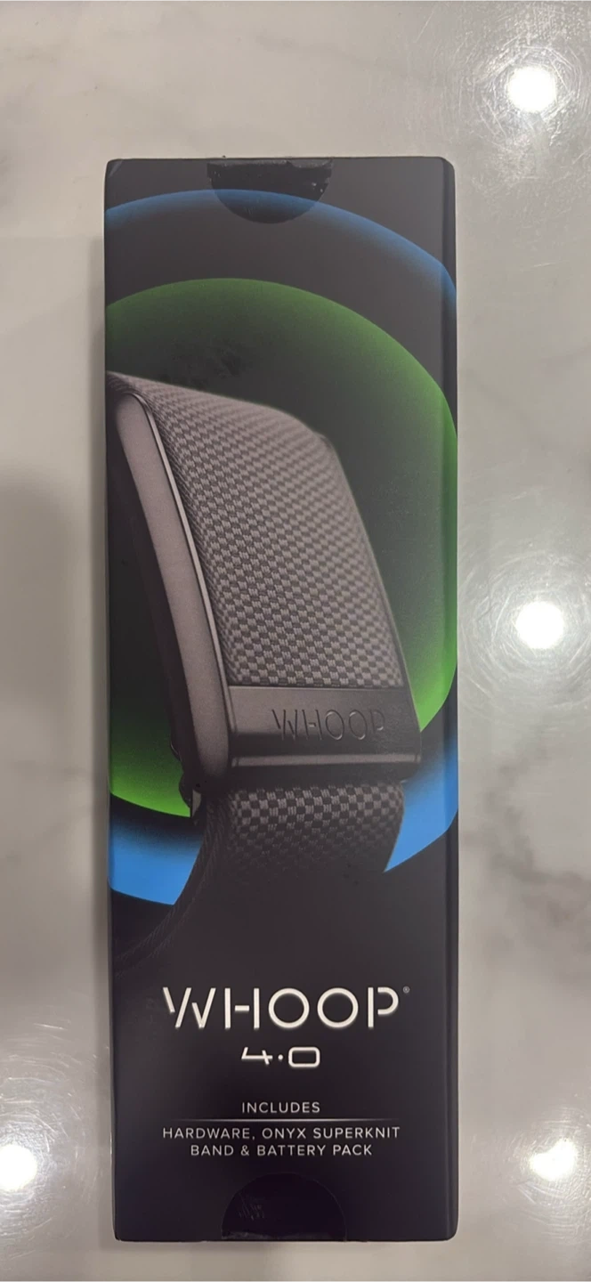 This is a WHOOP 4.0 fitness tracker system. It includes the hardware, an Onyx Superknit band, and a battery pack. It monitors sleep, strain, recovery, respiratory rate, blood oxygen, and heart rate metrics.