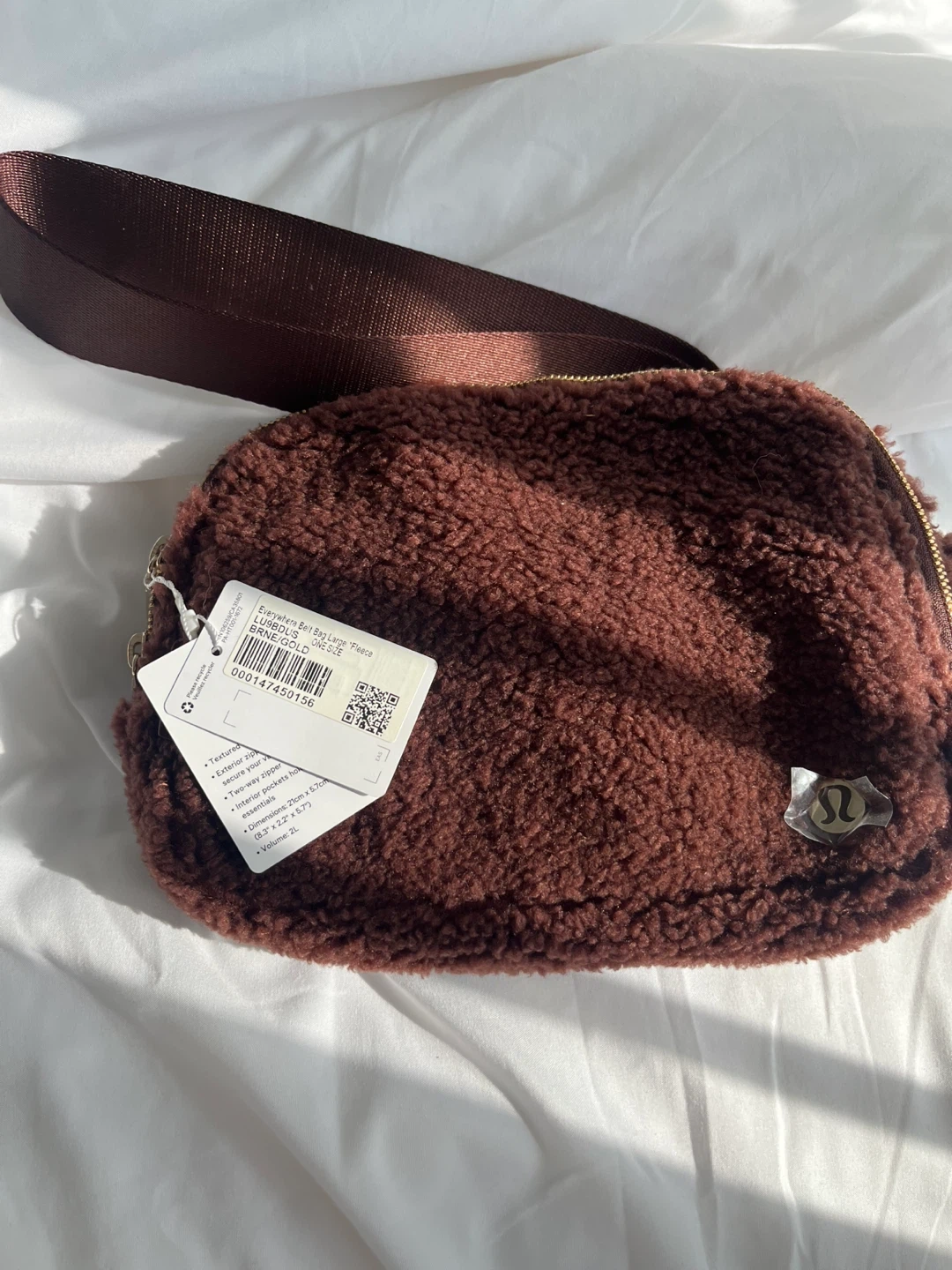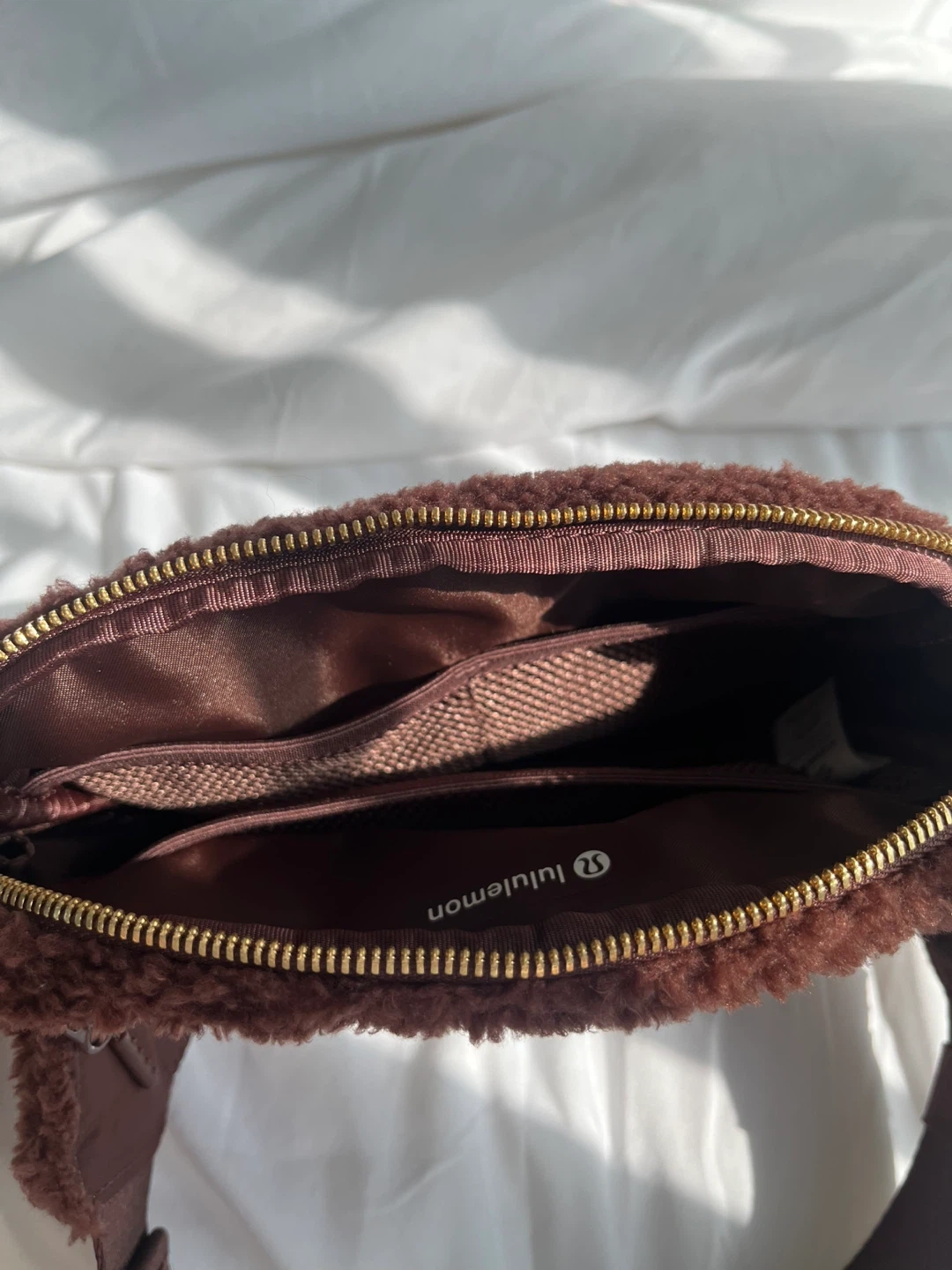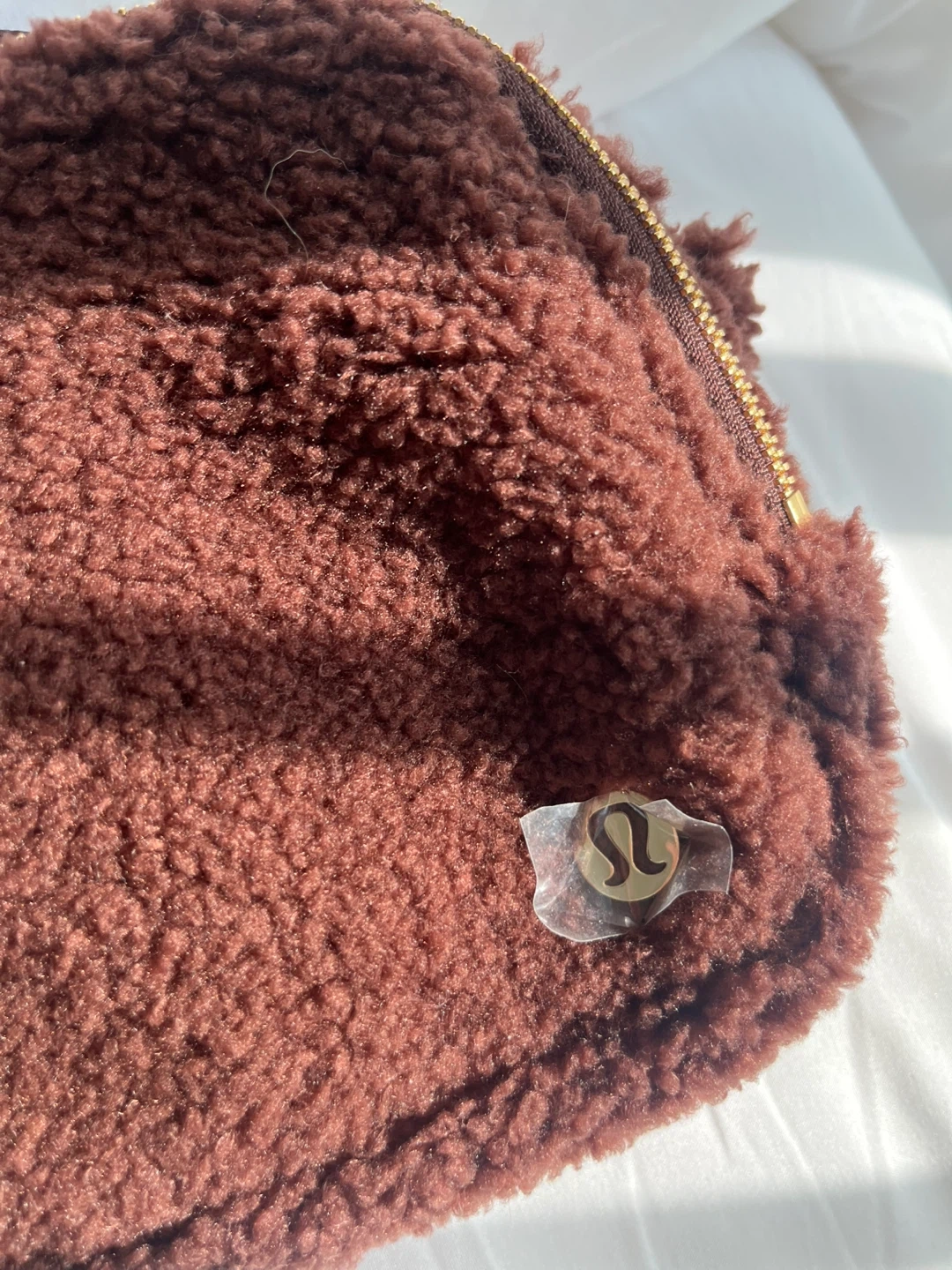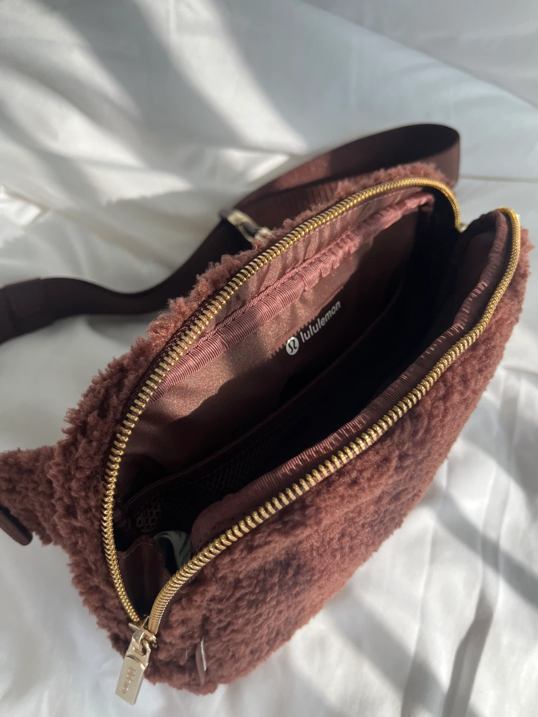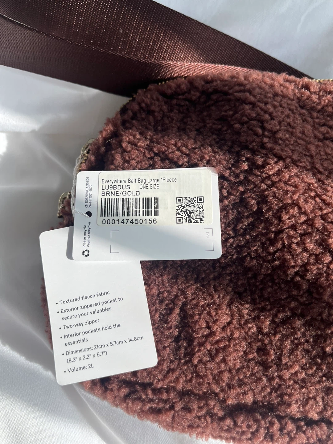 This Lululemon Everywhere Belt Bag is the large fleece version in Molleton Brindle Gold. It features textured fleece fabric and an exterior zippered pocket for your valuables. The two-way zipper and interior pockets keep your essentials secure. Dimensions are 21cm x 5.7cm x 14.6cm, with a volume of 2L.