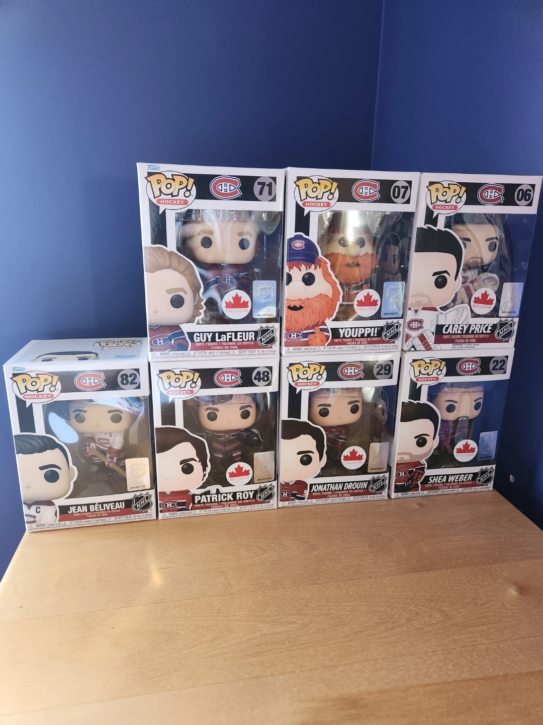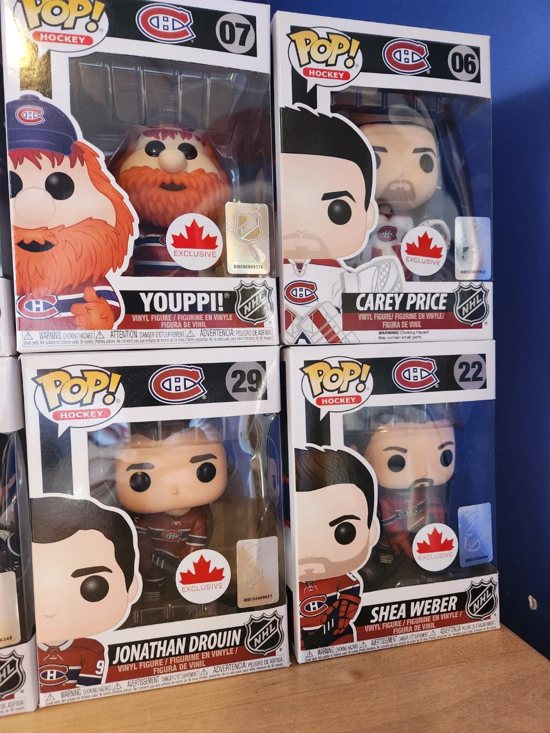 Collection of Funko Pop! vinyl figures featuring Montreal Canadiens players. Includes figures of Carey Price, Shea Weber, Jonathan Drouin, Youppi!, Guy Lafleur, Patrick Roy, and Jean Béliveau. Each figure comes in its original packaging.