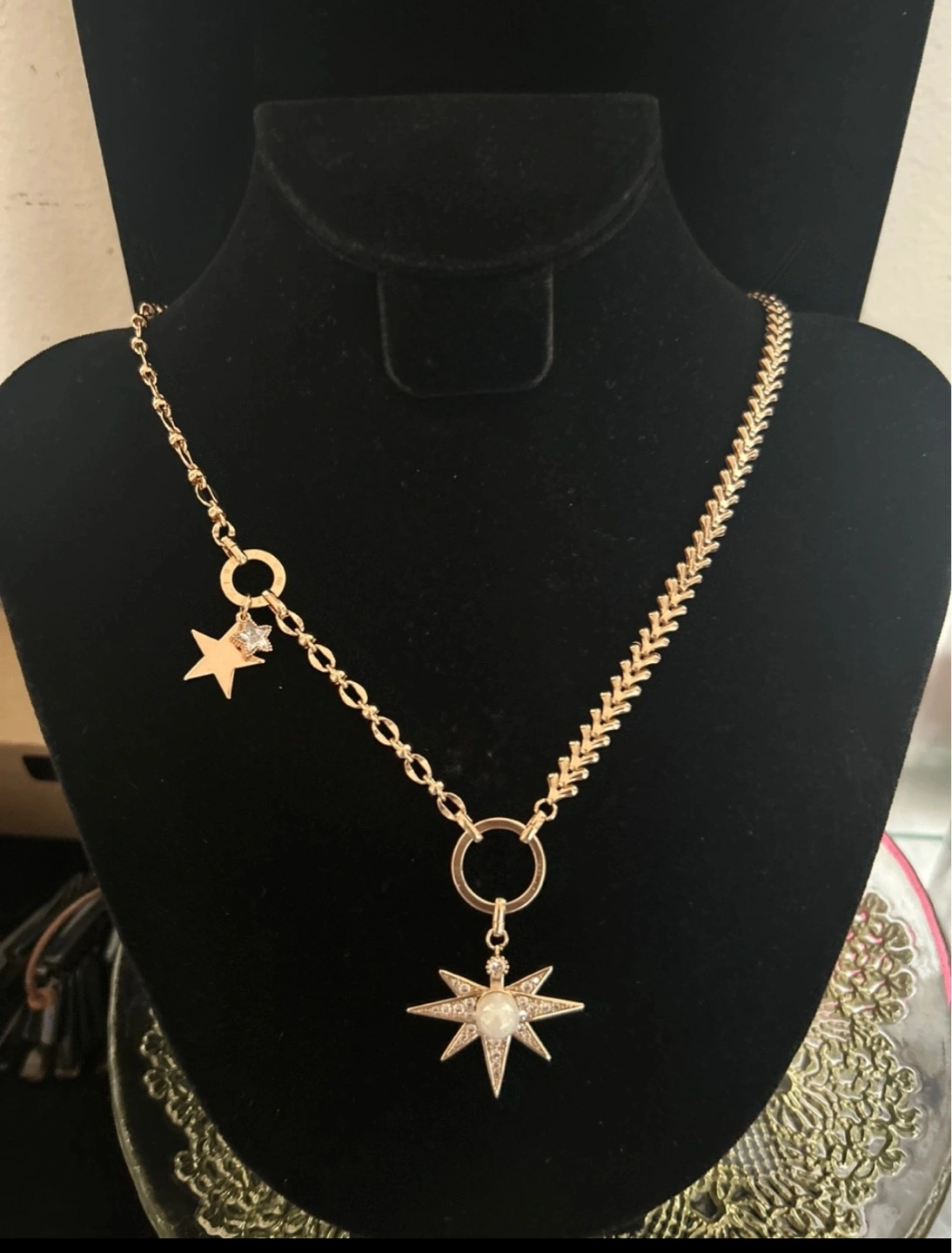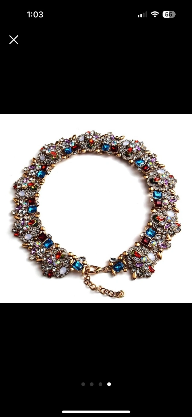 Selling a few gold plated fashion necklaces! One is a gold-toned chain link necklace with a decorative bar. Another is a multi-colored jeweled necklace. Brand New and ready to add some sparkle to your outfit