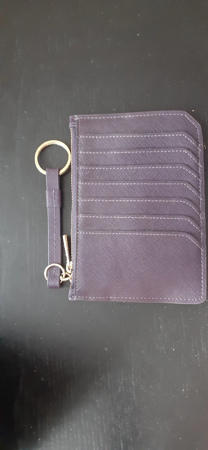 This is a small purple card holder. It has a zipper closure and multiple card slots on the back. A keyring and strap are attached for convenience. It's made of a durable, textured material.