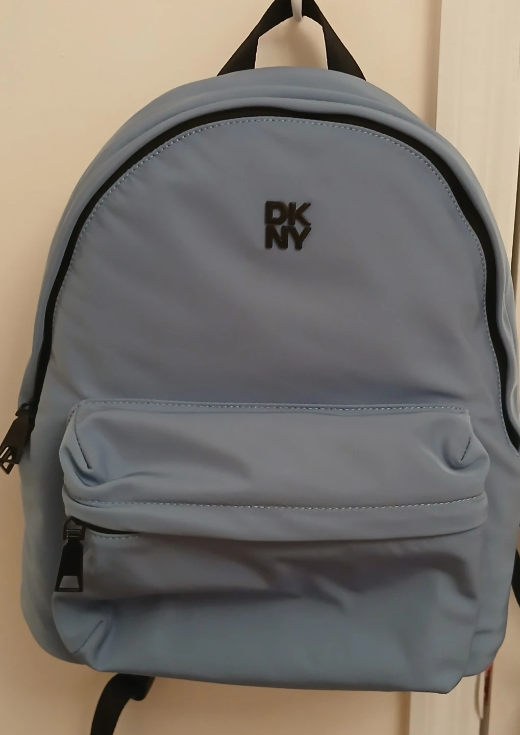 This is a blue DKNY backpack made of nylon.