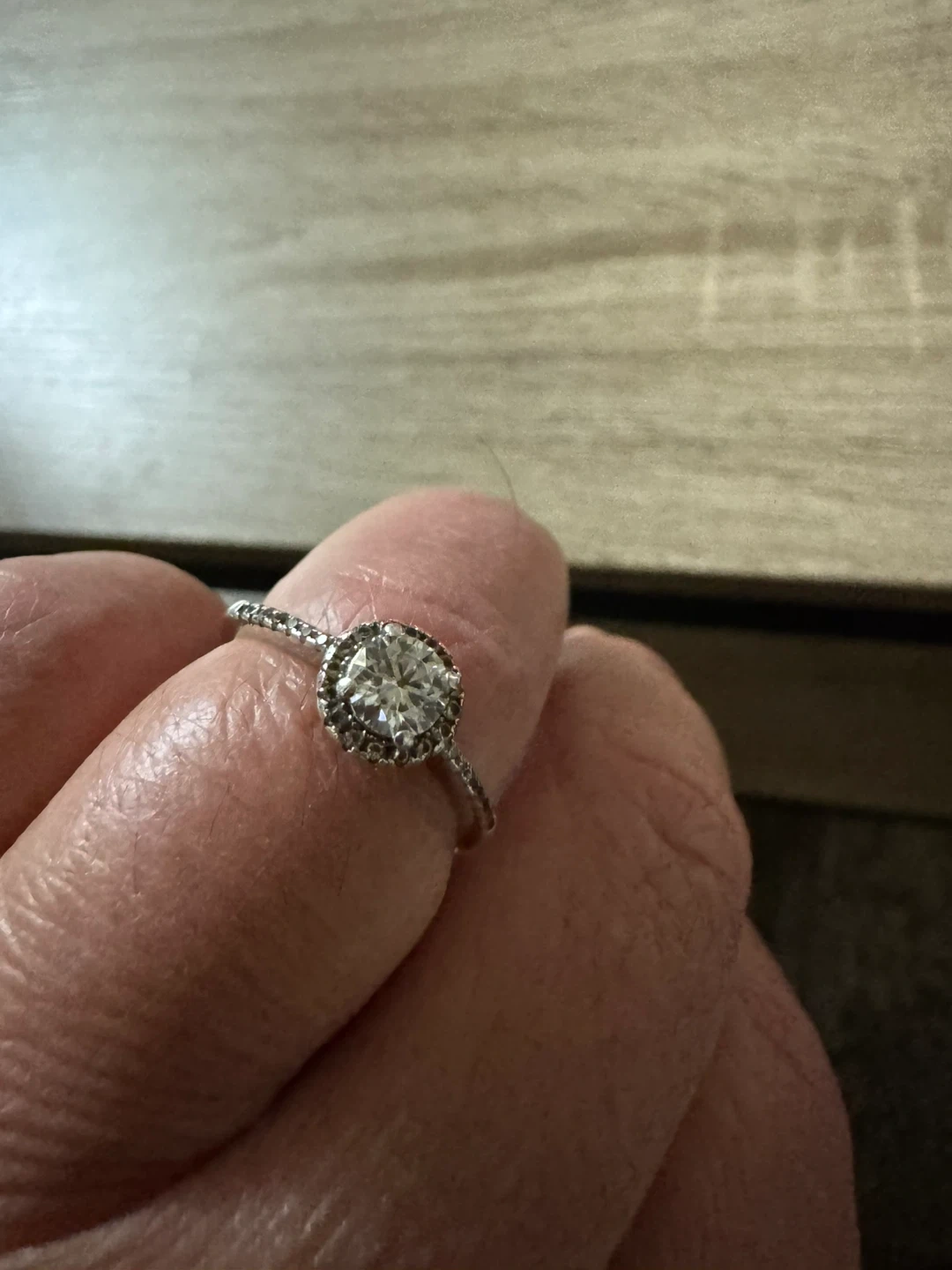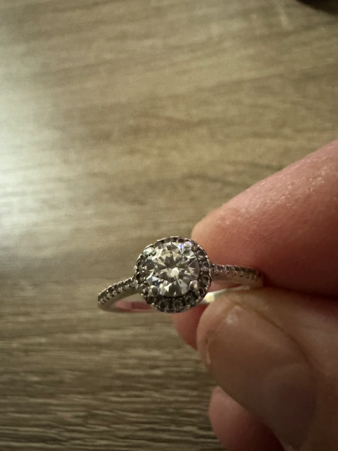 Sparkling halo engagement ring featuring a central stone surrounded by smaller accent stones. The band is also embellished with tiny stones. This ring adds a touch of elegance to any occasion. It's a beautiful choice for a special someone!