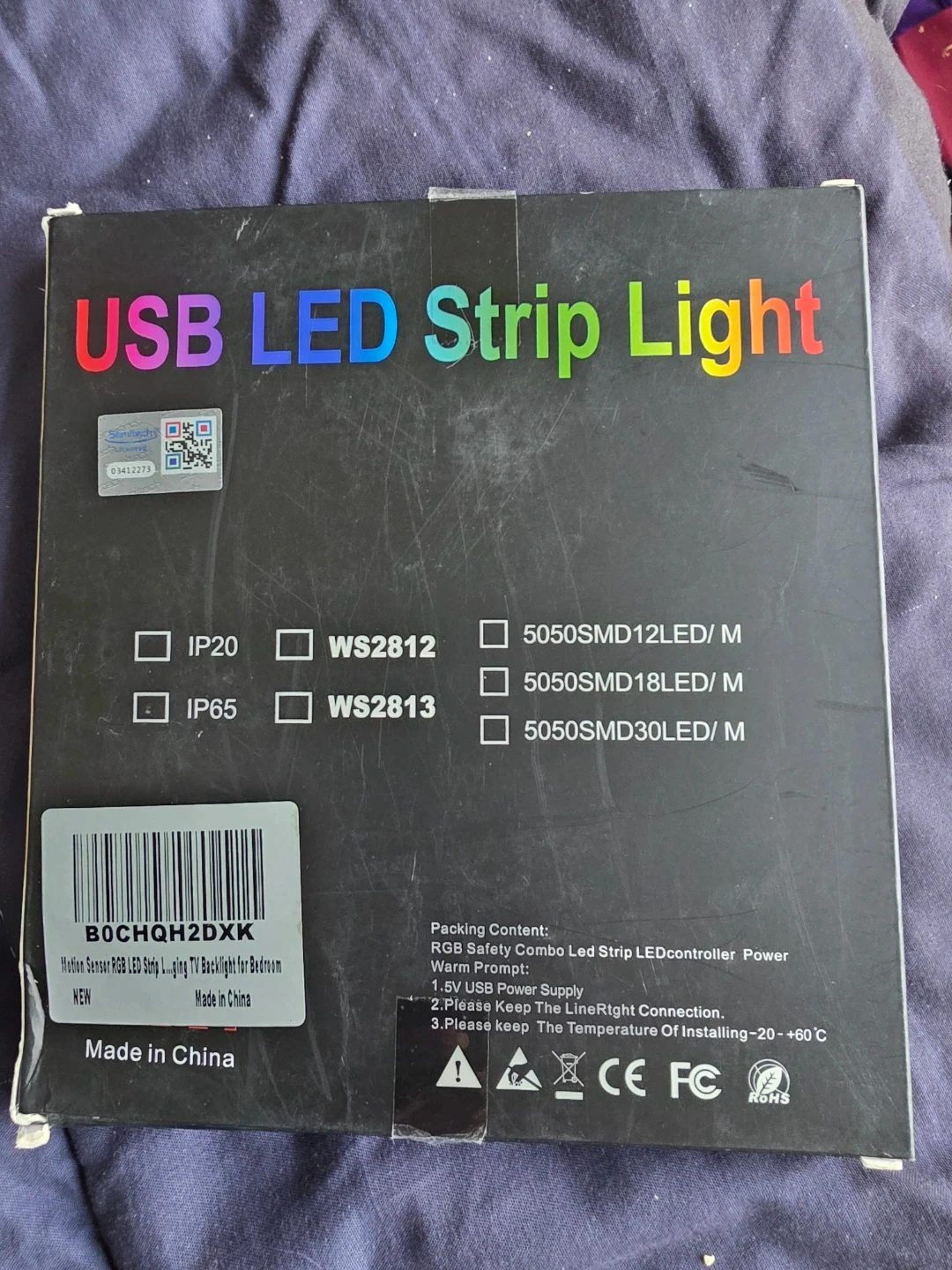 Decorative USB LED strip lights for creating ambient lighting. These lights are dimmable and offer RGB color options. Includes LED strip, controller, and power supply. Made in China.