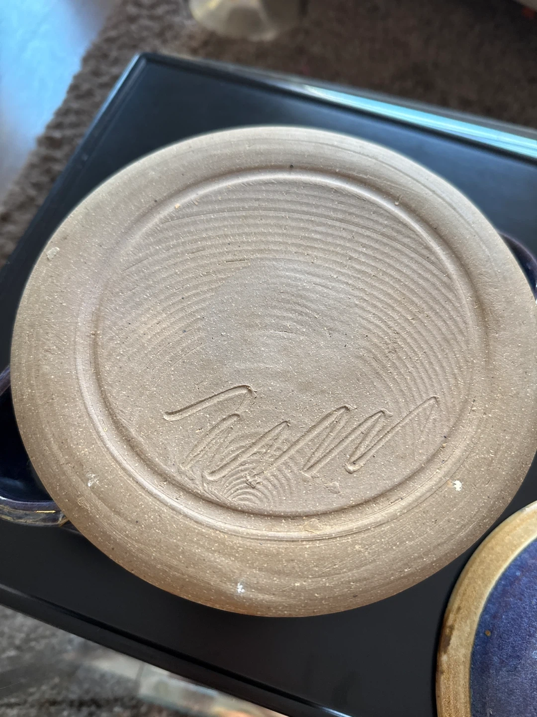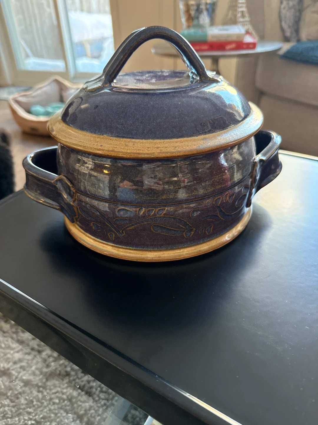 This is a beautiful handmade pottery casserole dish with a lid. It features a deep navy blue glaze with gold trim and decorative etching around the base. I am not sure who the potter is but it’s signed and likely purchased in southern Ontario. No chips or cracks. 6” diameter and 3” deep.