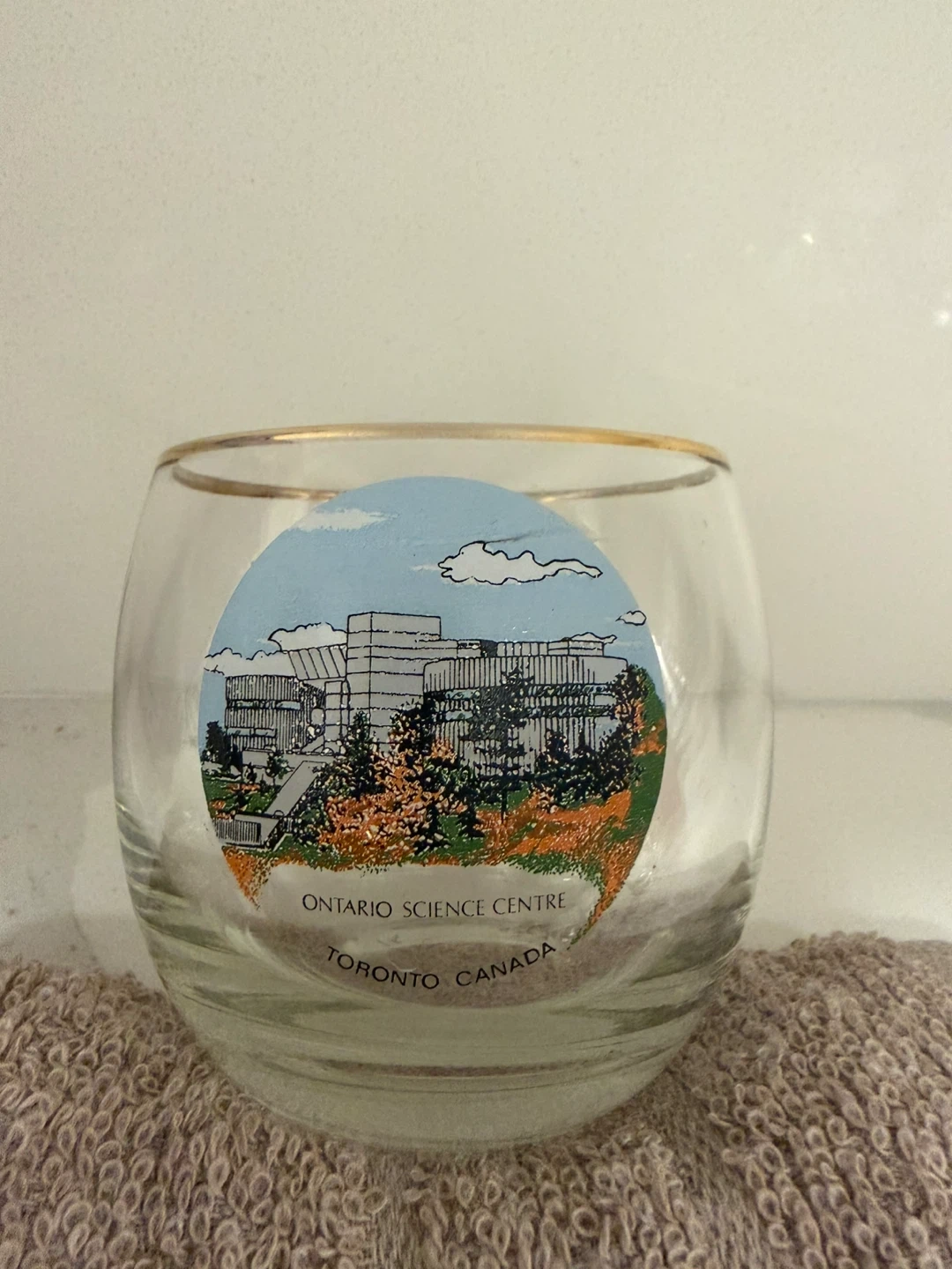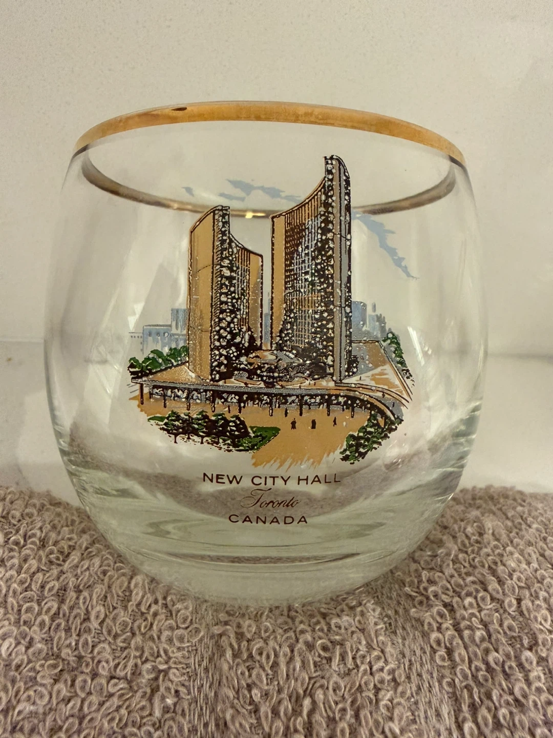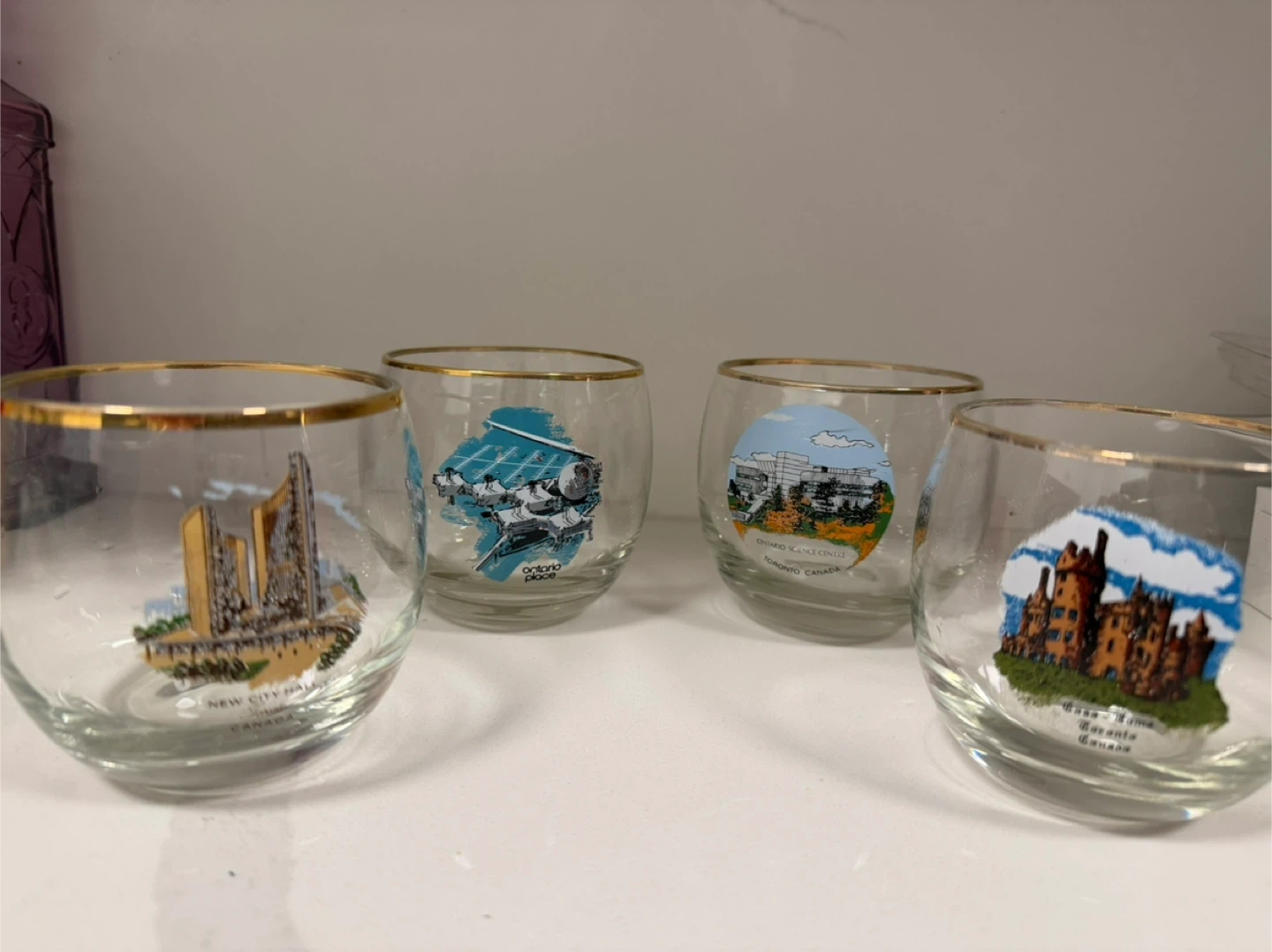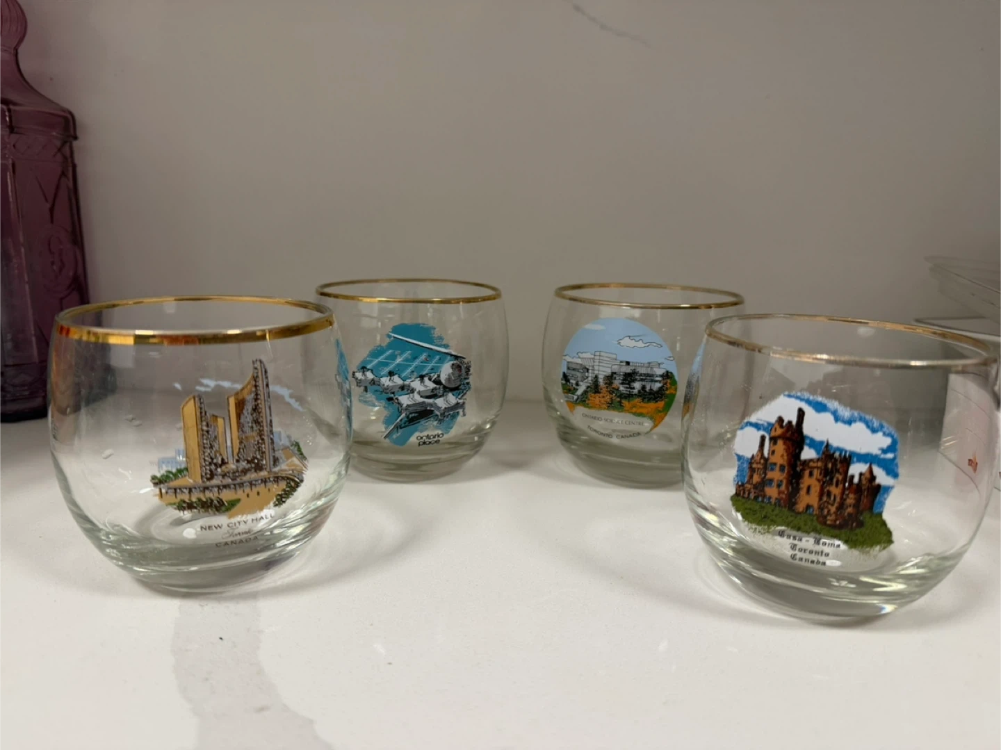Set of 4 vintage lowball/rolly poly glasses featuring iconic Toronto landmarks: New City Hall, Ontario Place, the Science Centre, and Casa Loma. Some wear on the paint and gold rims of some of the glasses as shown in photos.