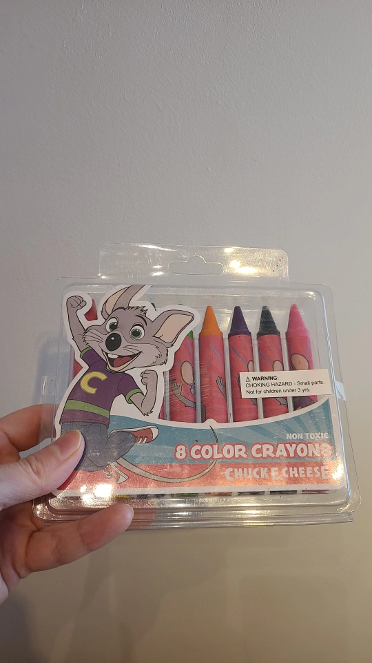 This is a set of 8 non-toxic crayons featuring Chuck E. Cheese. These crayons are suitable for colouring fun! WARNING: CHOKING HAZARD - Small parts. Not for children under 3 yrs.