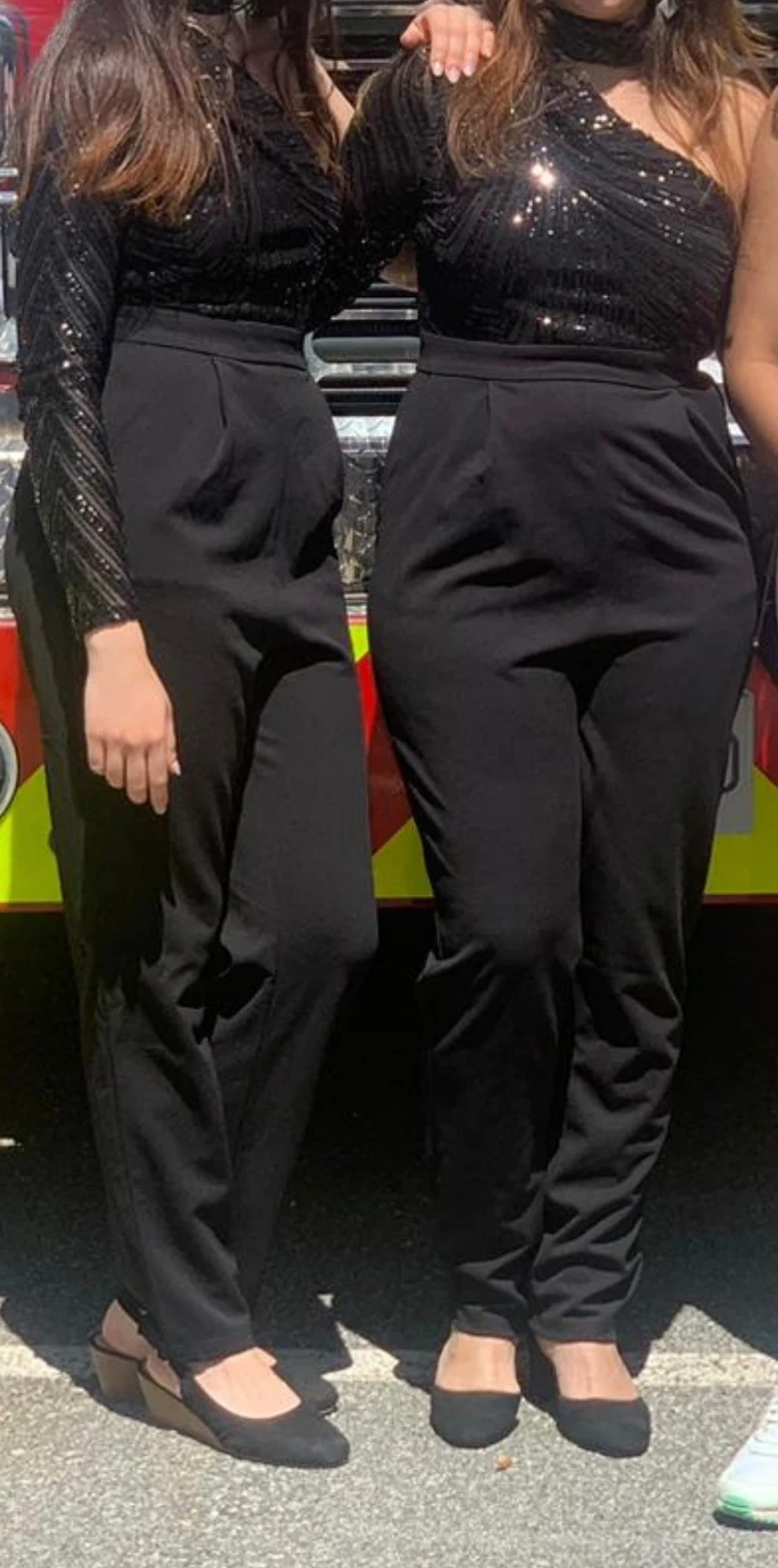 Stylish black jumpsuit with a one-shoulder design featuring sequin detailing on the bodice. This piece offers a chic silhouette perfect for evening wear. It's made from a comfortable fabric with a flattering fit.