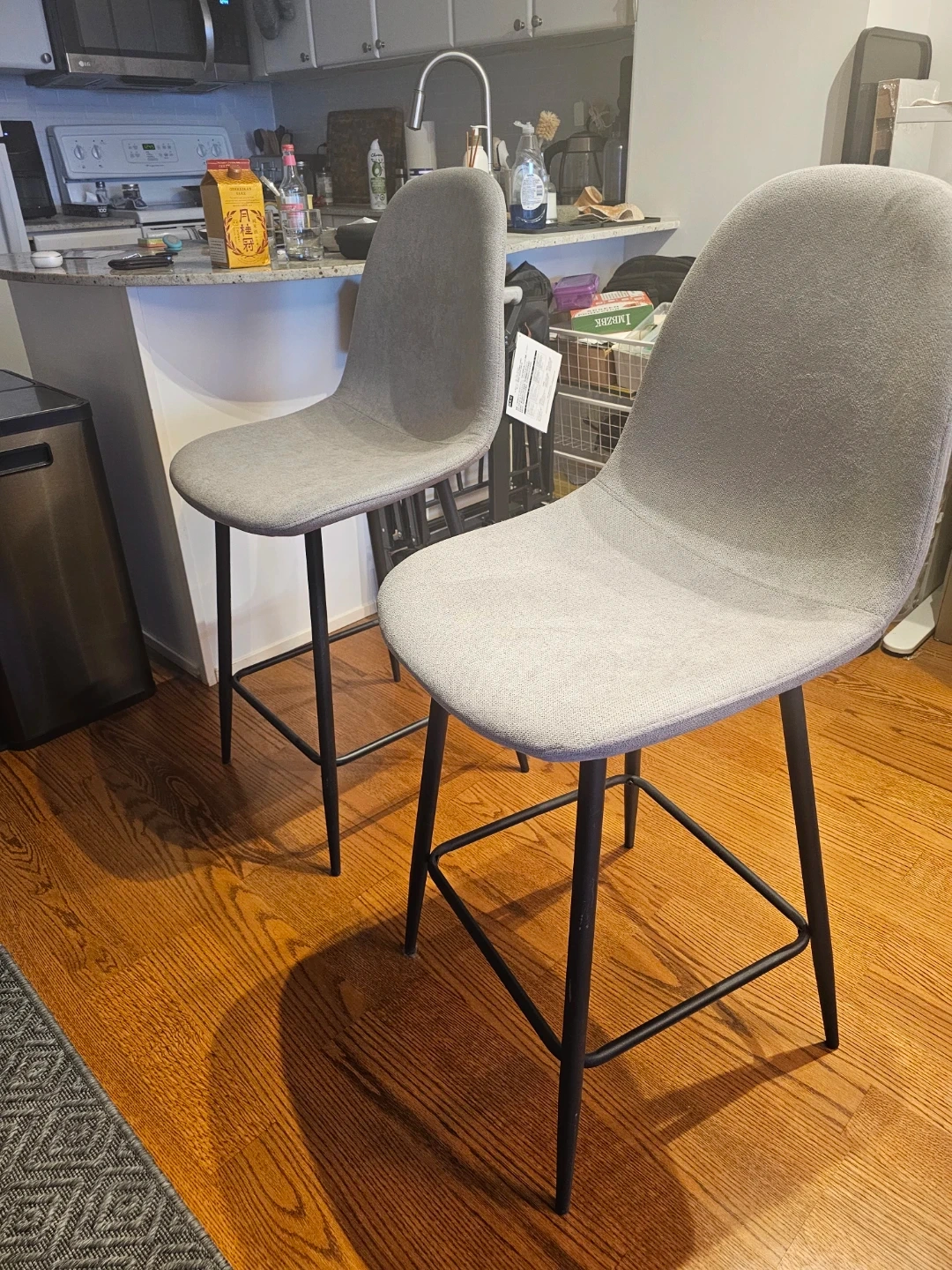 Two grey upholstered bar stools with black metal legs. Seat height measures approximately 26 inches. Perfect for a kitchen island or counter.