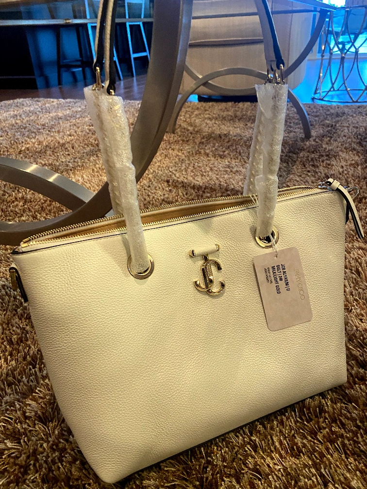 Brand new authentic Jimmy Choo handbag in white textured leather. Features a gold-tone JC logo and zip closure. Includes original tags.