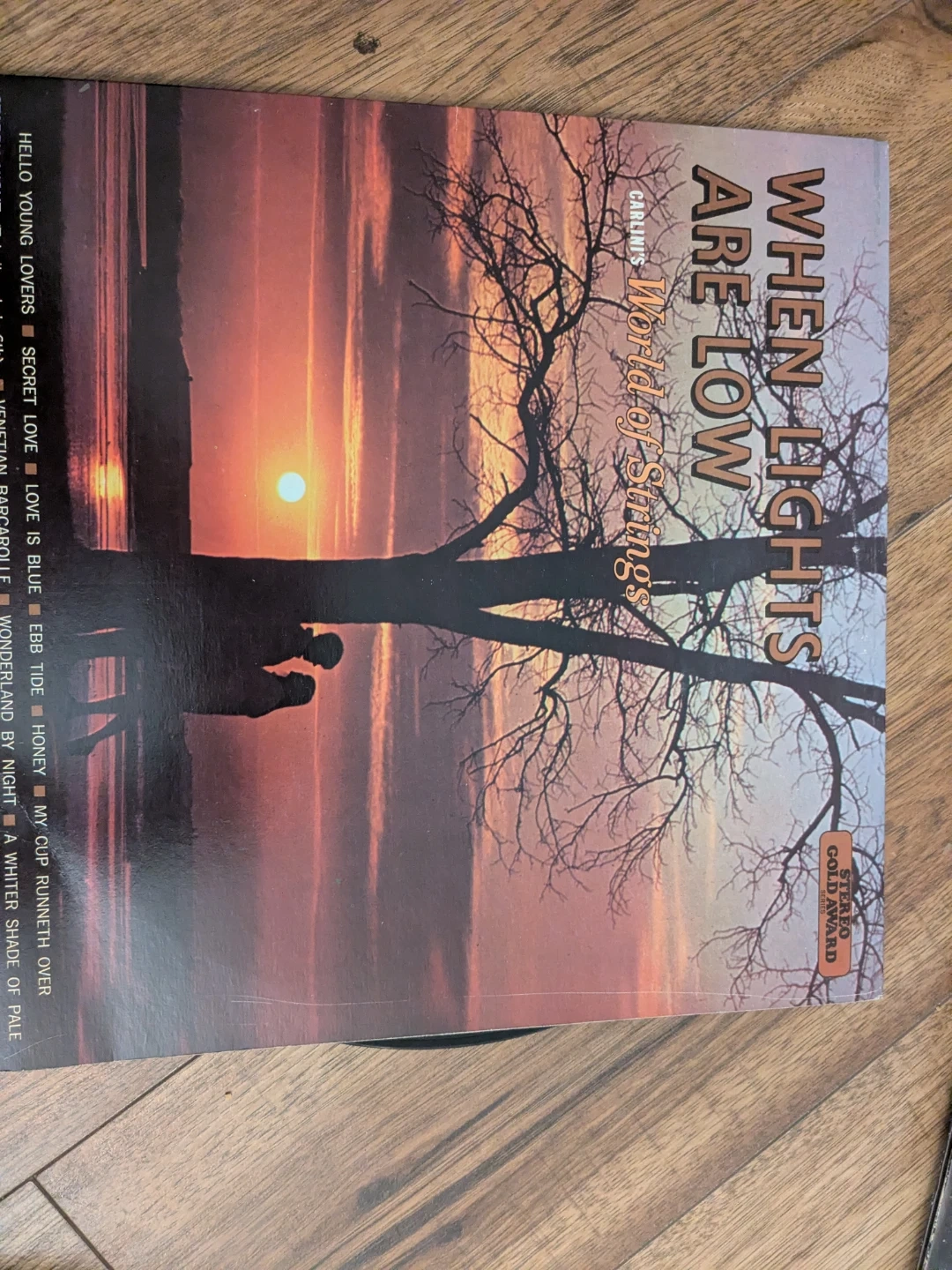 Selling a vinyl record titled 'When Lights Are Low' by Carlinis World of Strings. This record has a Stereo Gold Award designation. The songs listed on the cover include: