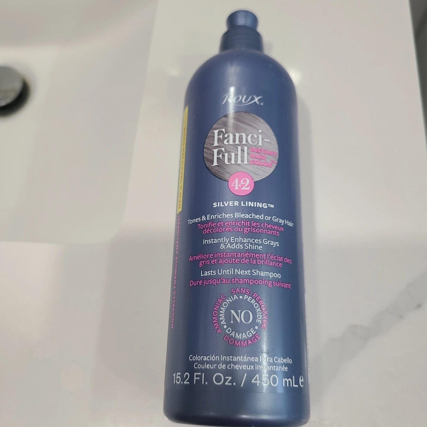 This Roux Fanci-Full 42 Silver Lining instantly tones and enriches bleached or gray hair, adding shine. It lasts until your next shampoo and is ammonia and peroxide-free, with no damage. The bottle contains 15.2 fl oz / 450 mL.