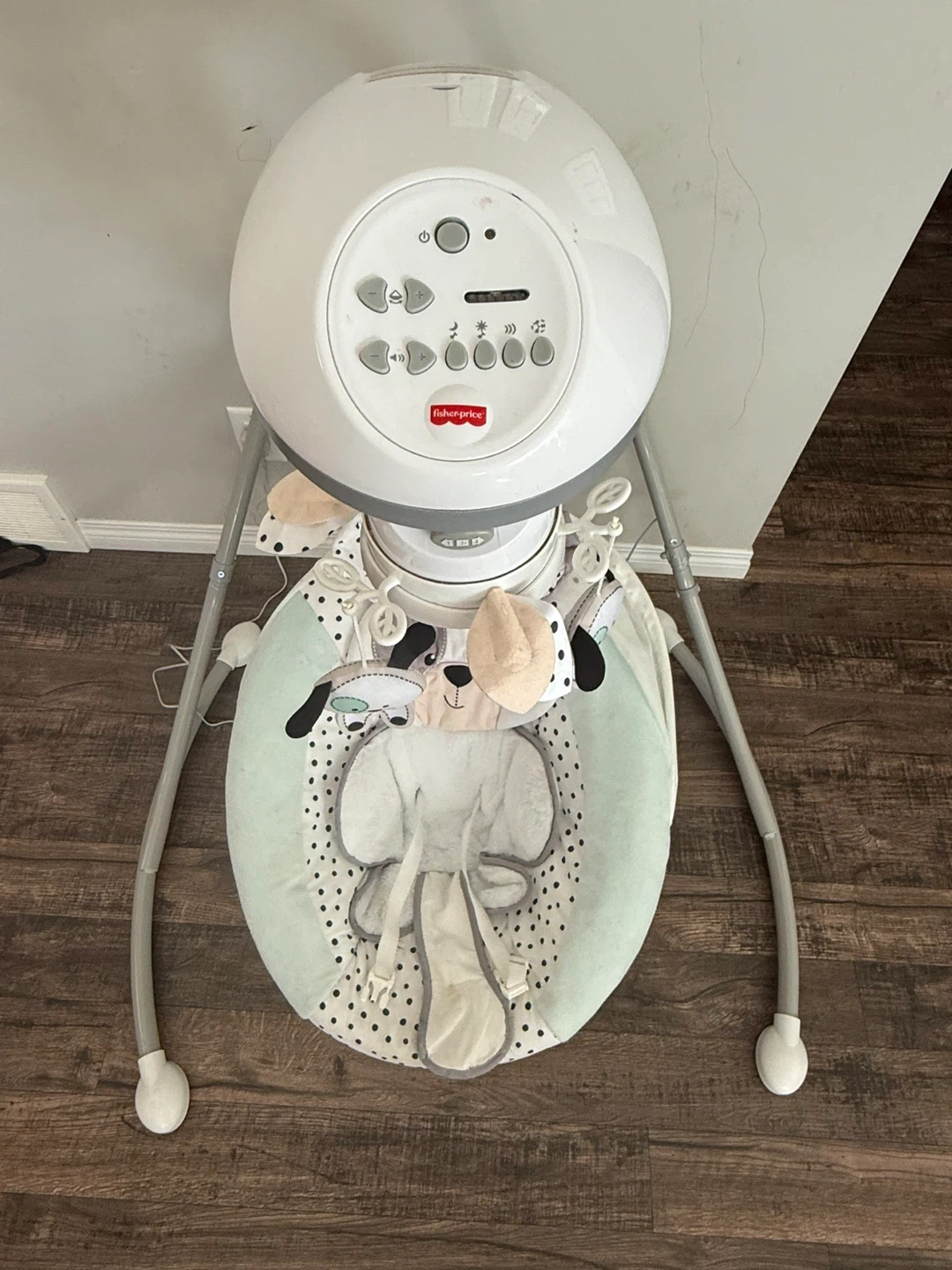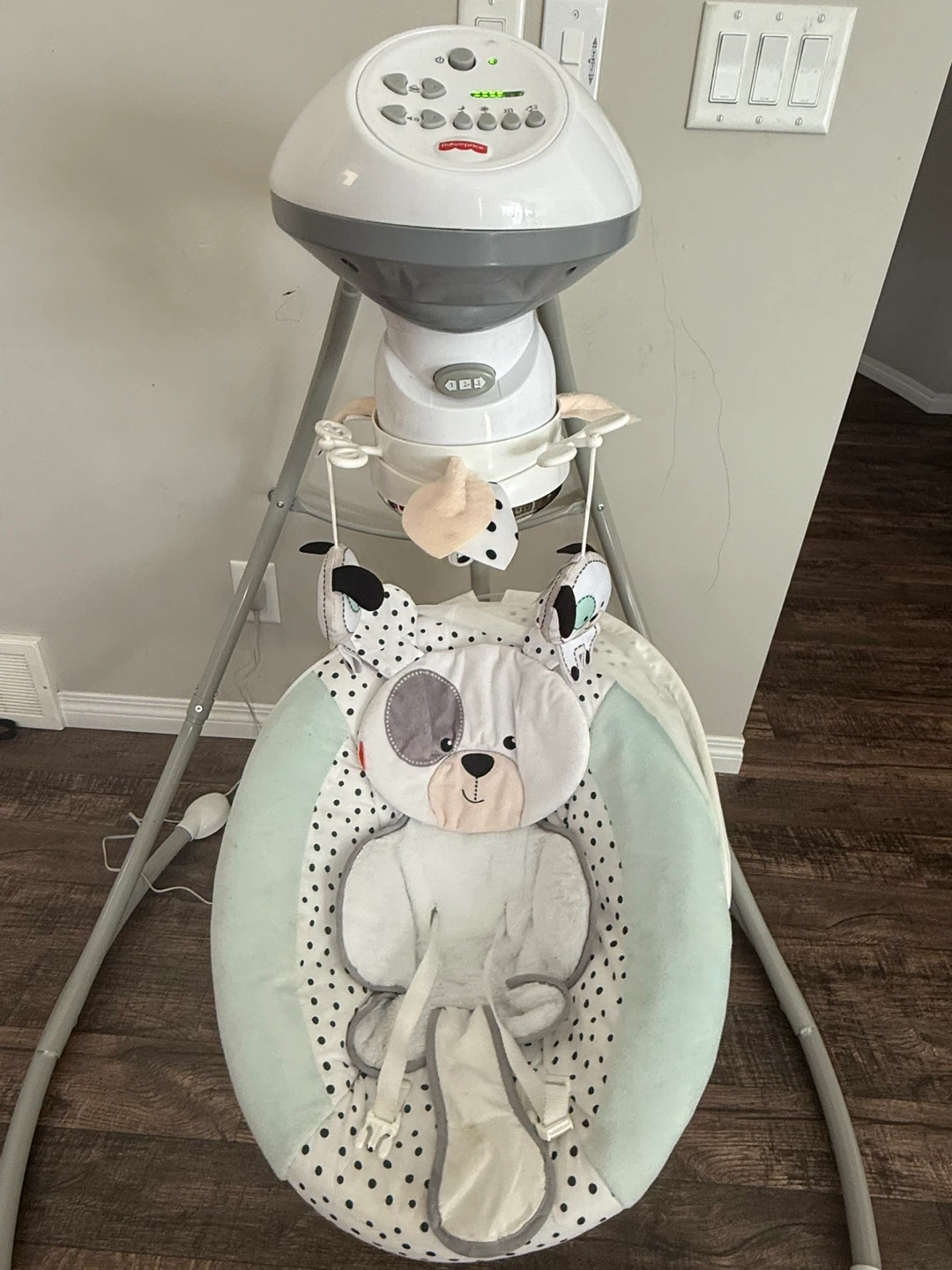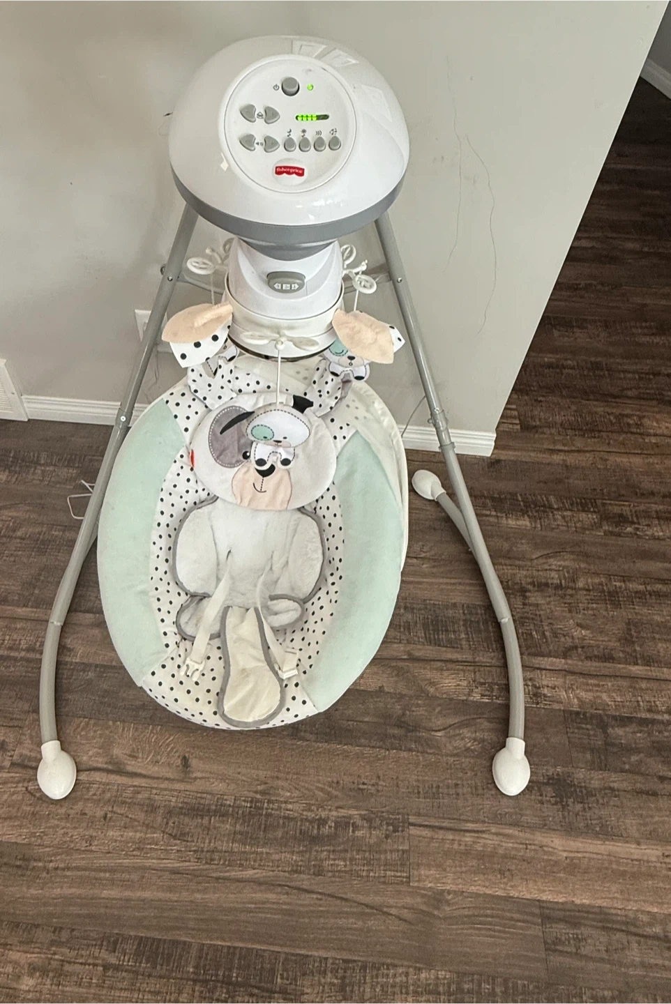 This Fisher-Price baby swing features a playful dog design and multiple swing speeds. It has a soft, padded seat for your little one's comfort. Adjustable music and sound settings are available.