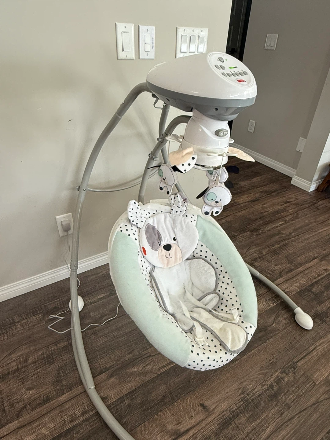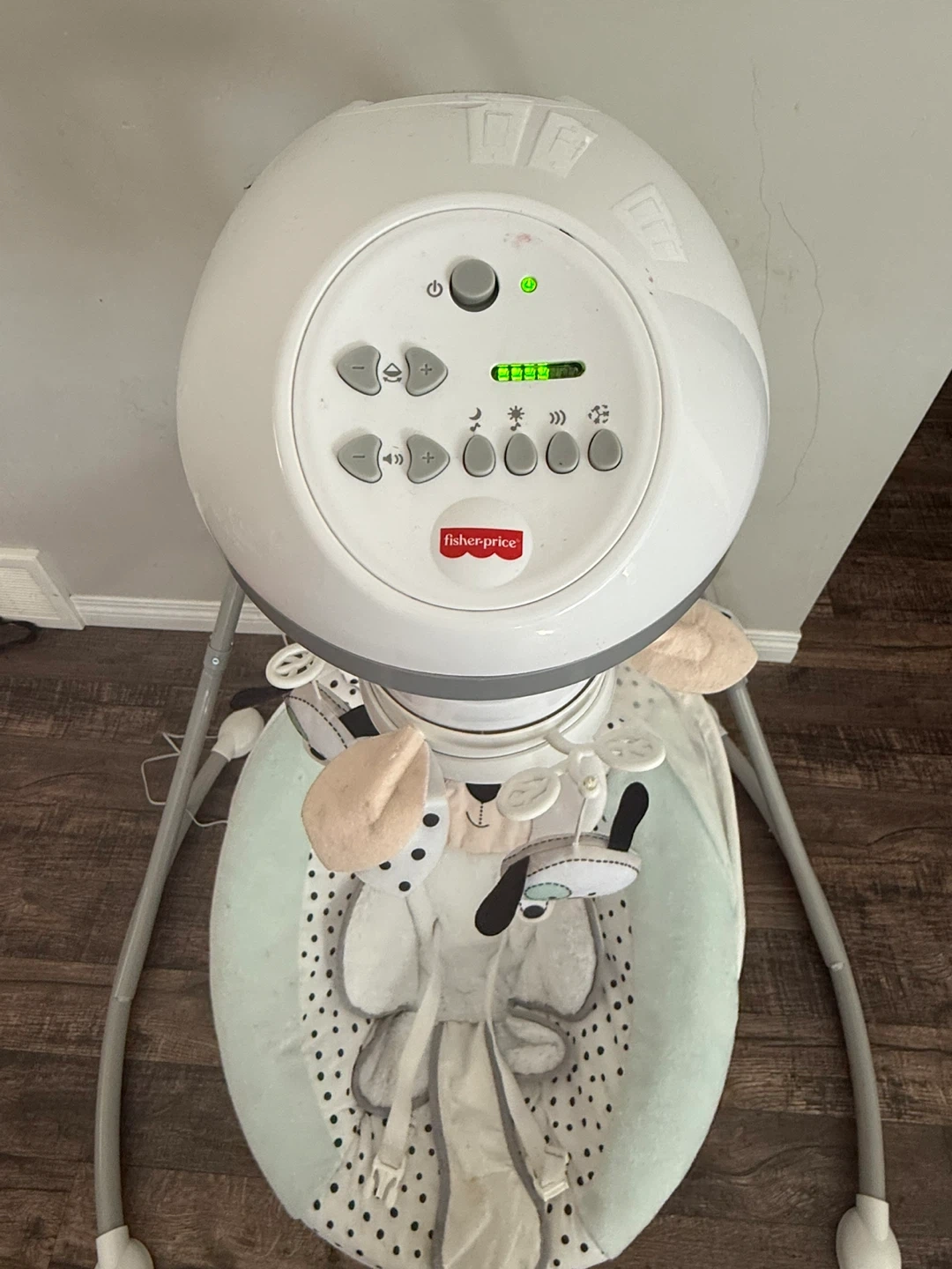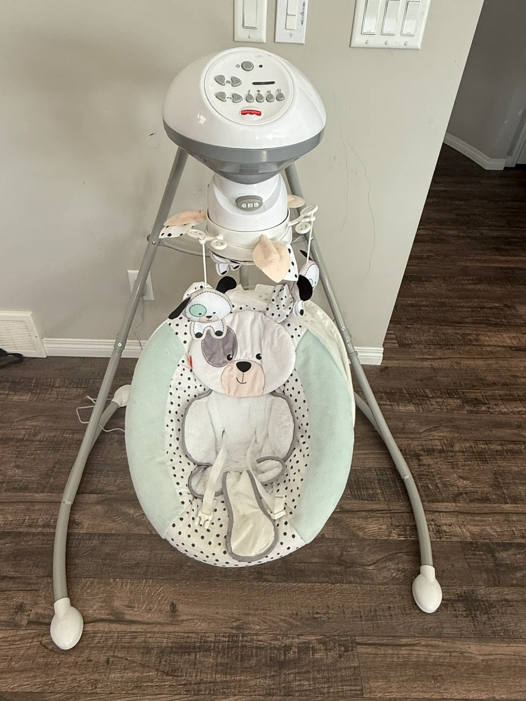 This Fisher-Price baby swing features a playful dog design and multiple swing speeds. It has a soft, padded seat for your little one's comfort. Adjustable music and sound settings are available.