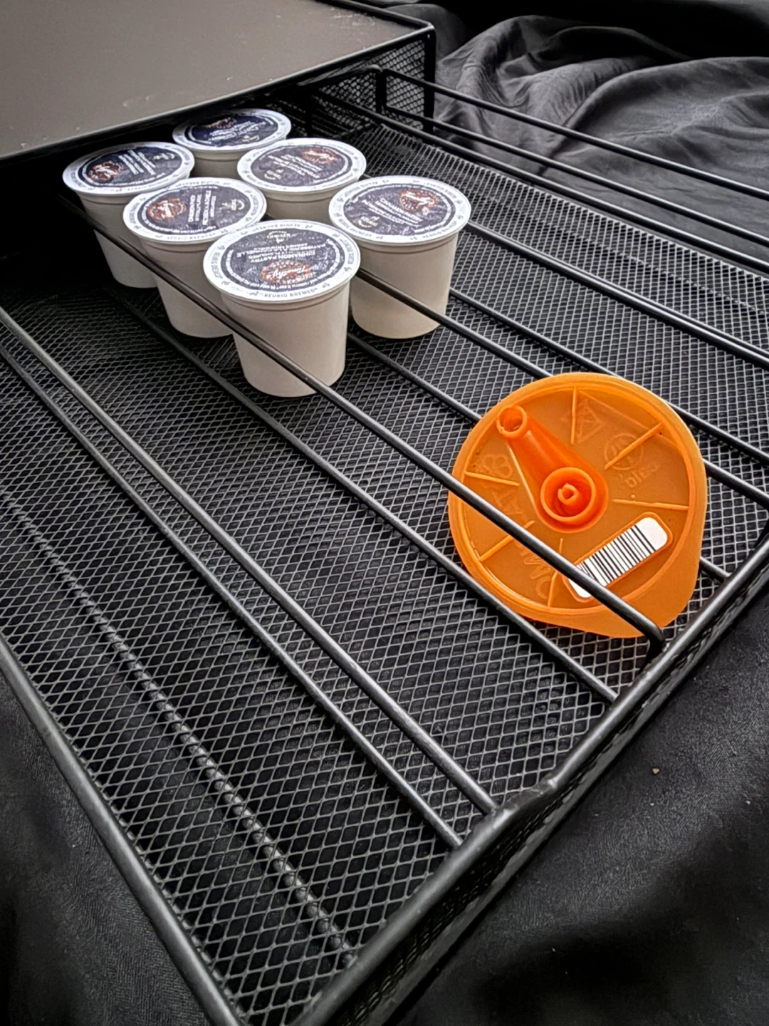 This is a black mesh drawer organizer designed to hold K-Cup coffee pods. It's a convenient way to store and access your coffee pods right by your brewer. It has multiple drawers for easy organization.