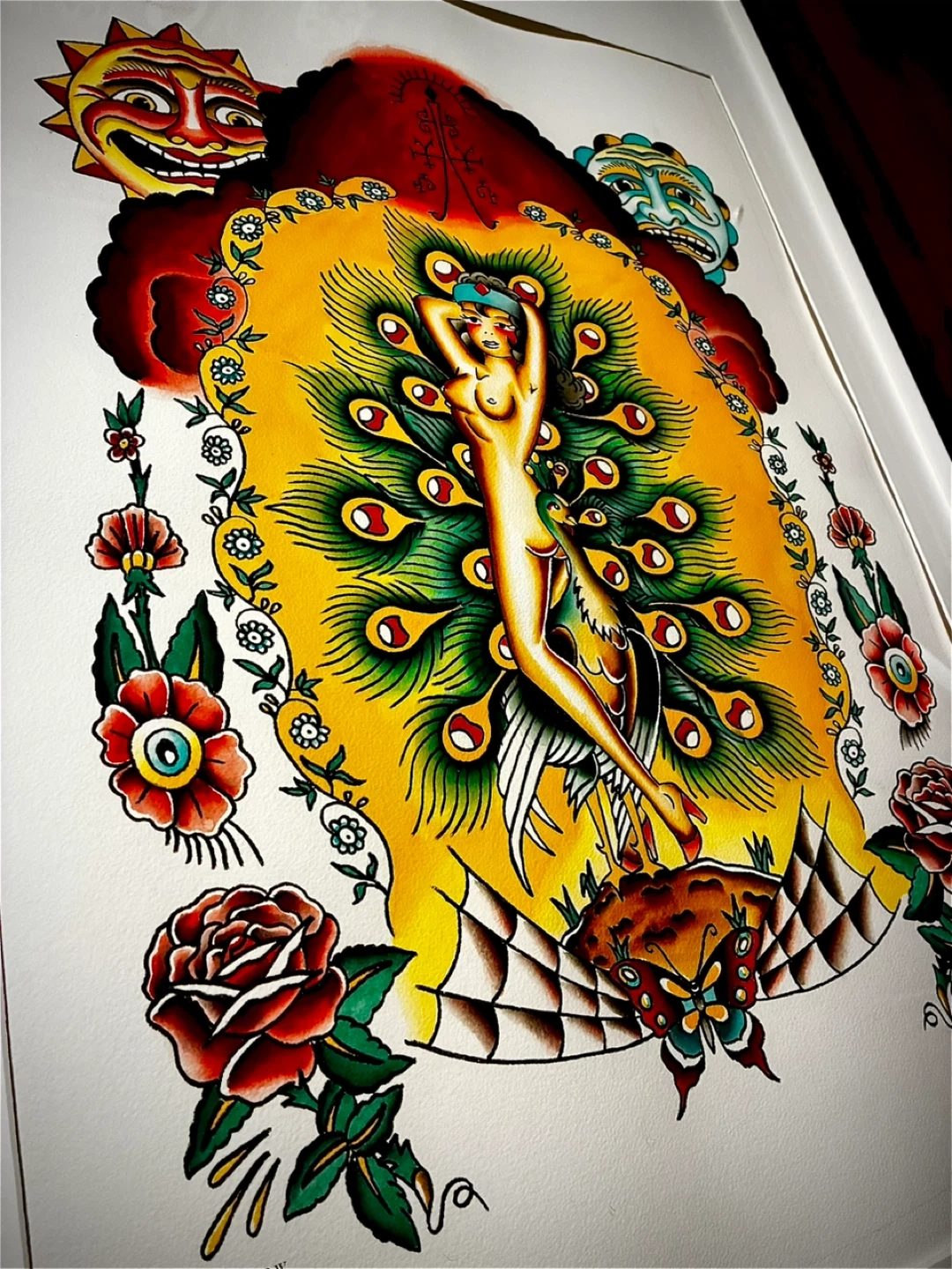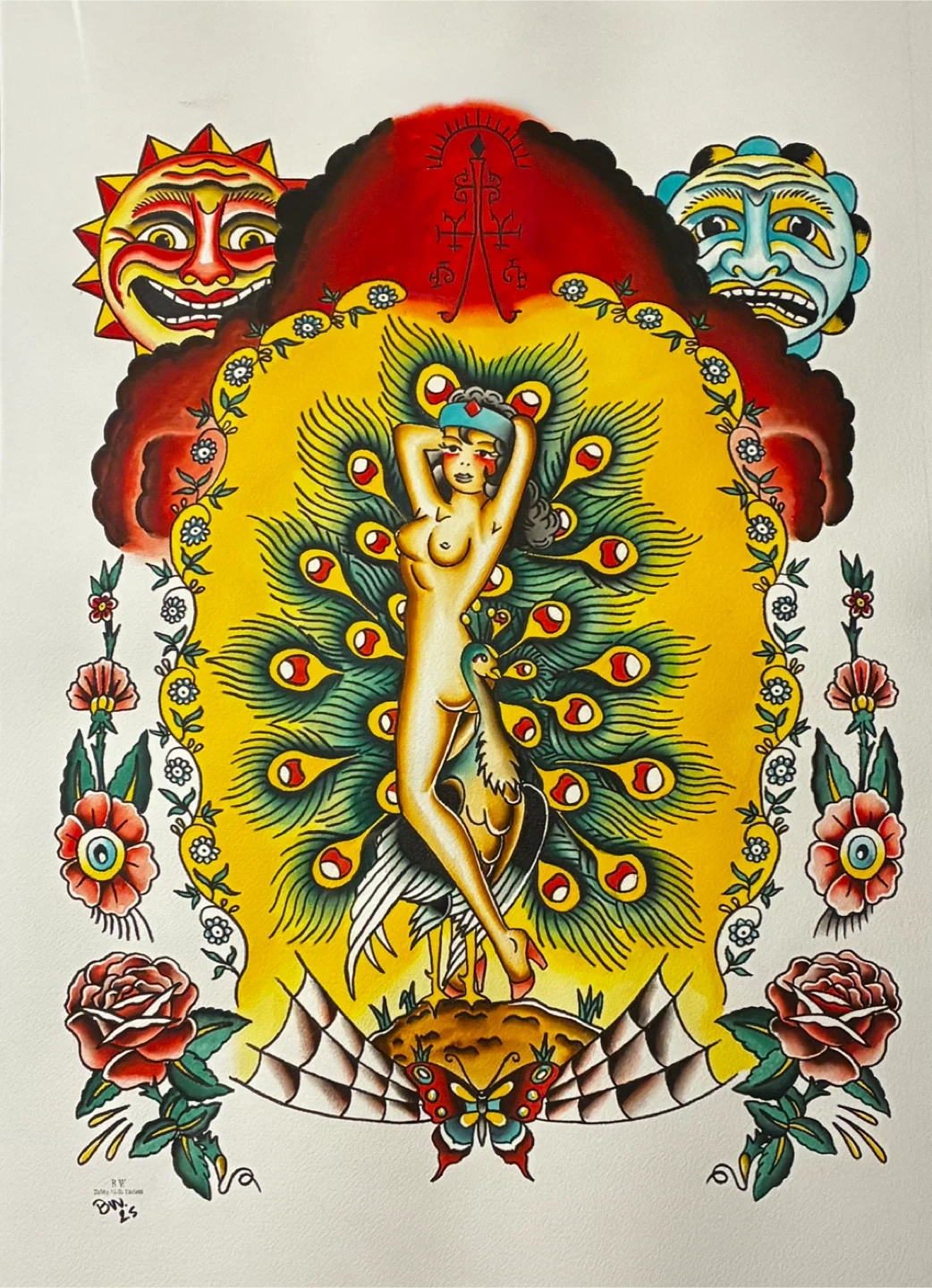 This framed print showcases vibrant tattoo-style artwork featuring a woman and a peacock. It's surrounded by decorative elements like sun faces, roses, and butterflies. The art is presented in a simple black frame. This piece would add a unique aesthetic to any space.