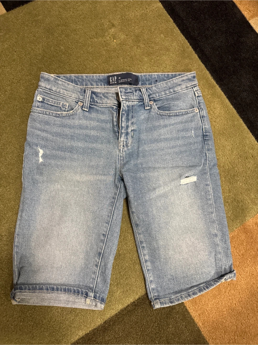 Gap denim shorts in a light blue wash. They're a size 26. Includes a rolled hem and some distressed details. These shorts are made of denim.