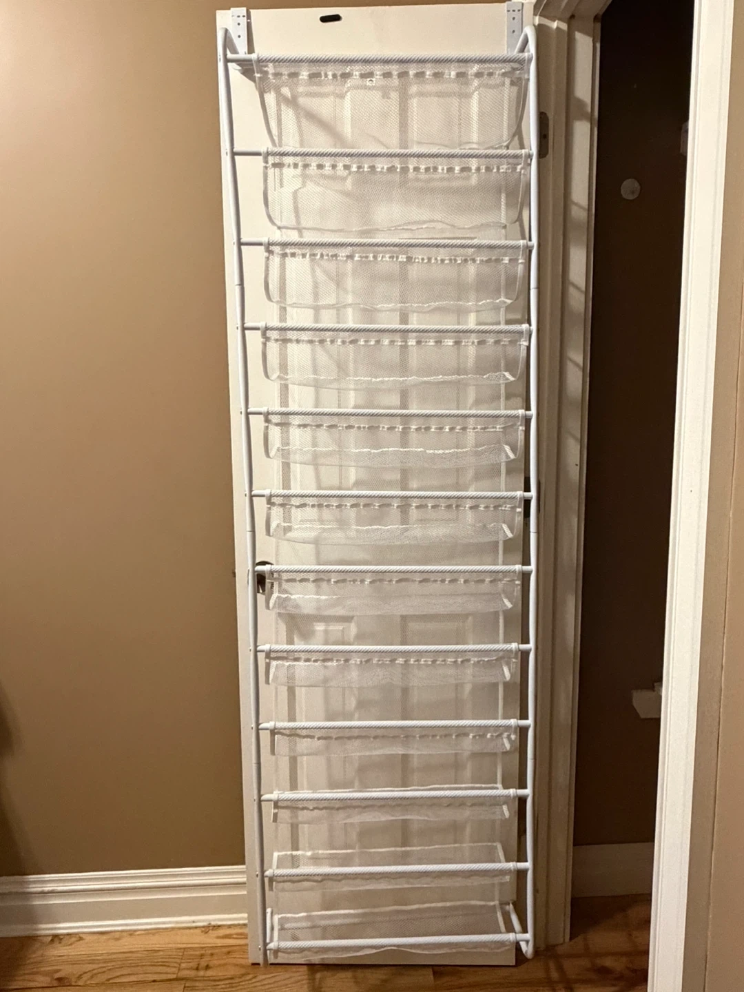 Handy over-the-door hanging organizer. It's perfect for adding extra storage space in your closet, bathroom, or any room where you need a little more organization. The white color is neutral and will fit in with any decor. It features multiple tiers of mesh pockets, so you can easily see and access your items.