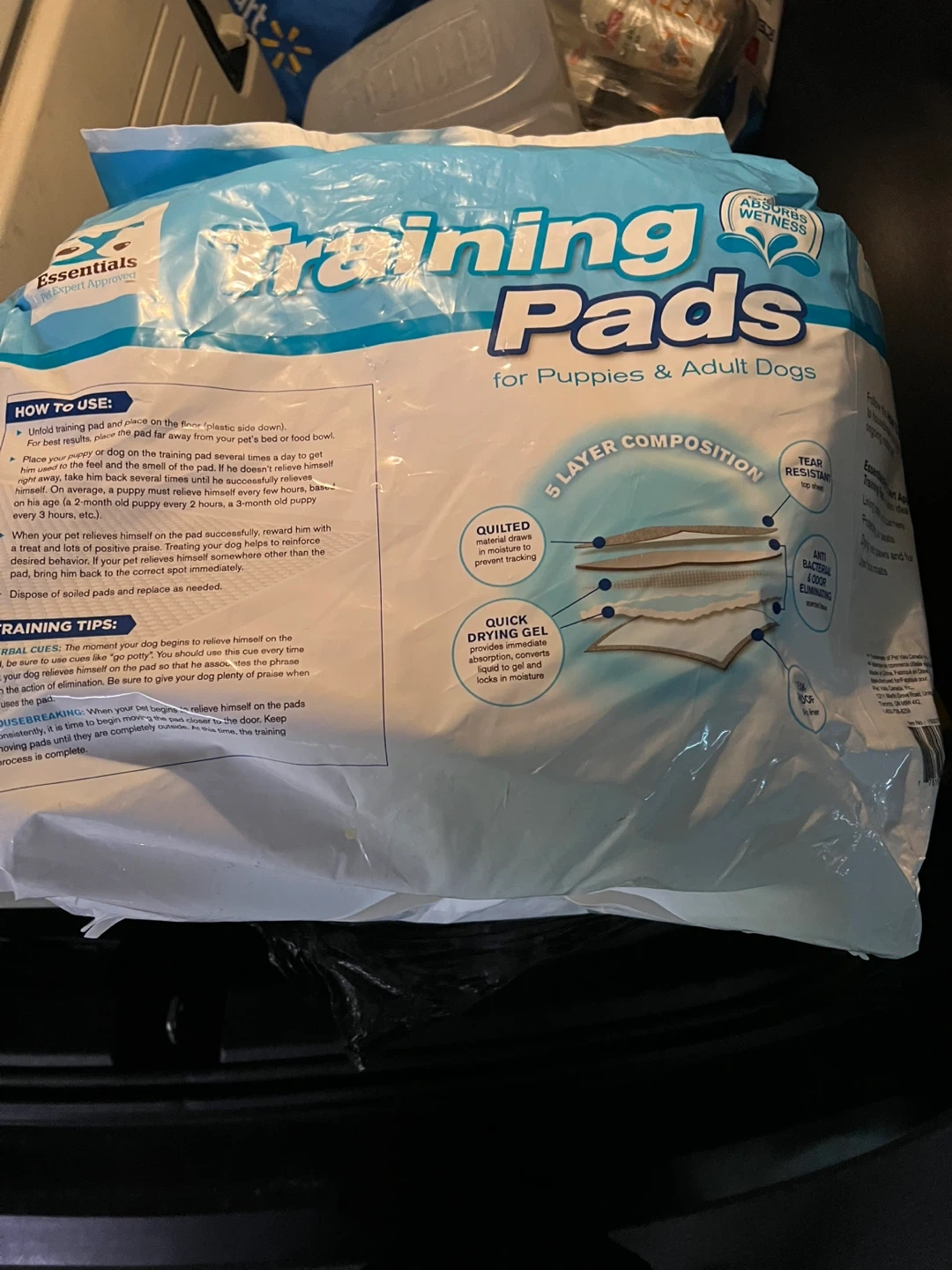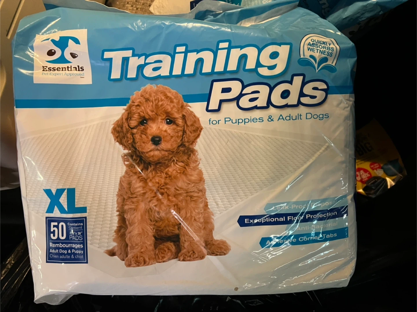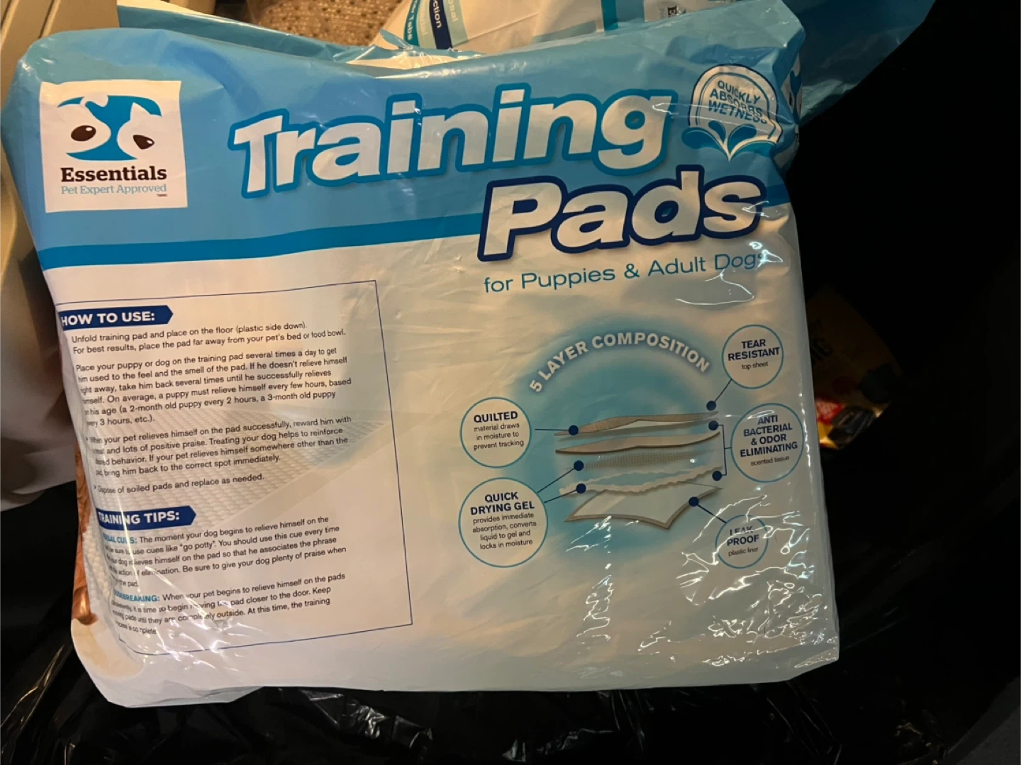 Essentials Pet Expert Approved Training Pads for Puppies & Adult Dogs. These XL training pads are ideal for long periods of time, elderly dogs, or physically challenged dogs. Each pad is designed with 5 layers for maximum protection and quick drying gel that instantly absorbs and locks in moisture. There are 50 pads in the package