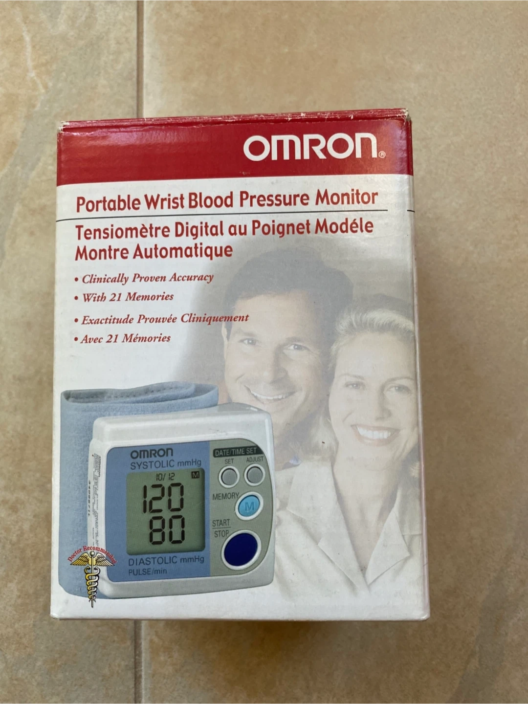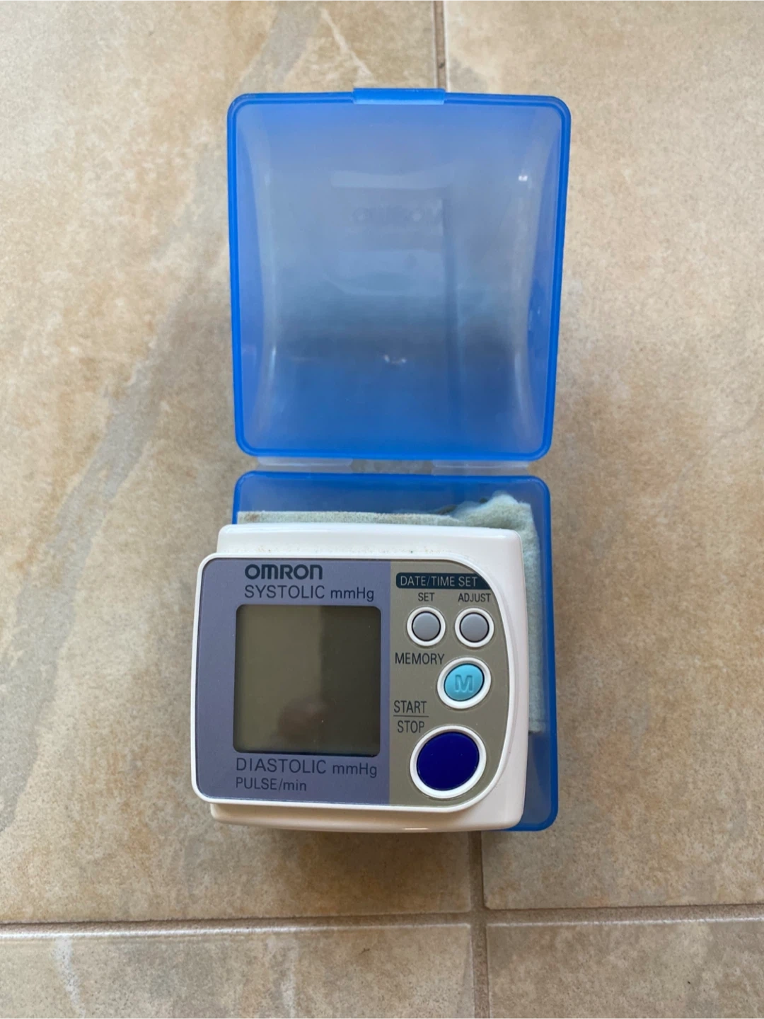 This is an Omron portable wrist blood pressure monitor. It offers clinically proven accuracy and includes 21 memories for tracking readings. It's a convenient way to monitor your health at home. Comes with original box and case.