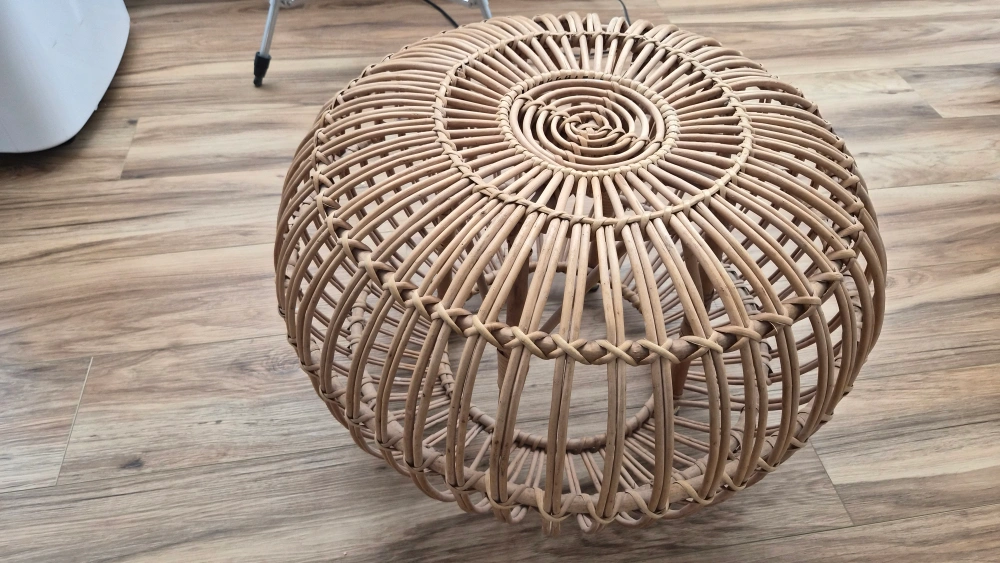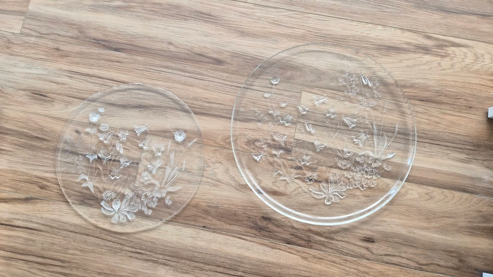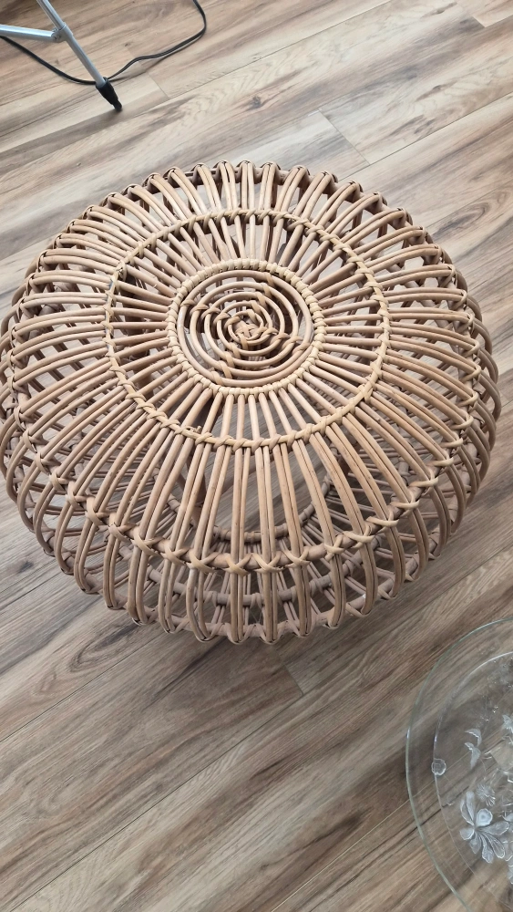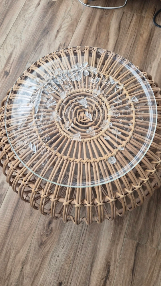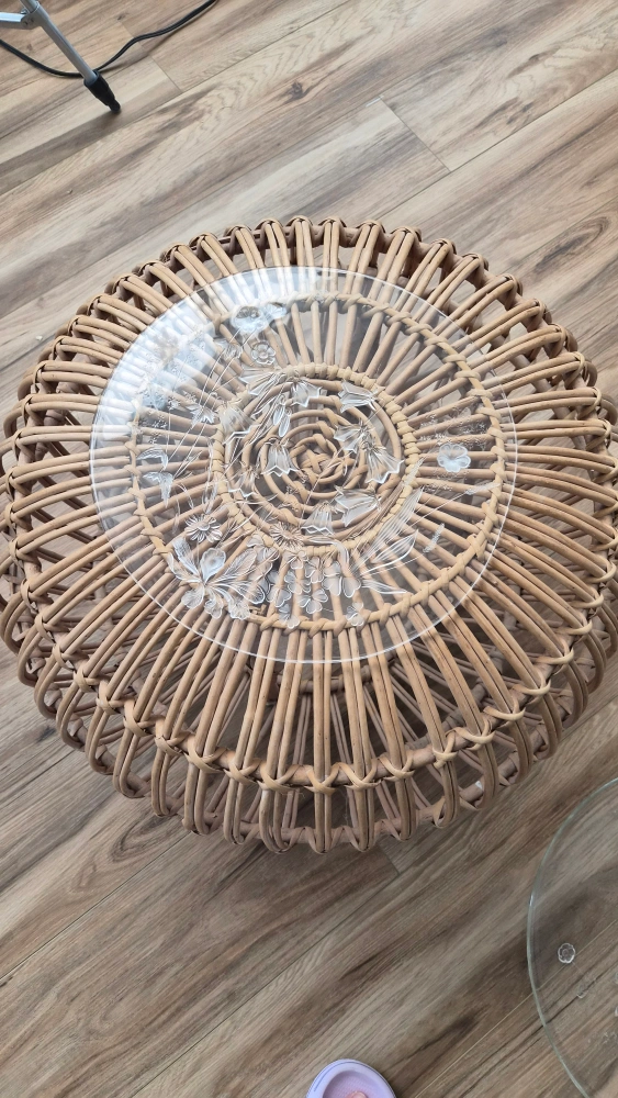 This is a round rattan ottoman with a decorative glass top. It includes two glass plates, one large and one small, both with etched floral designs. The woven rattan base offers a natural, bohemian aesthetic
