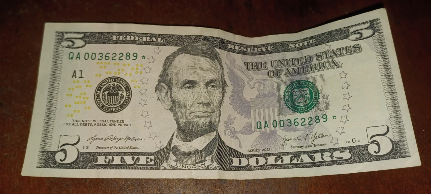 This is a genuine United States $5 bill featuring Abraham Lincoln on the obverse and the Lincoln Memorial on the reverse. It's a Federal Reserve Star Note from the Series of 2021. A standard denomination for everyday transactions!