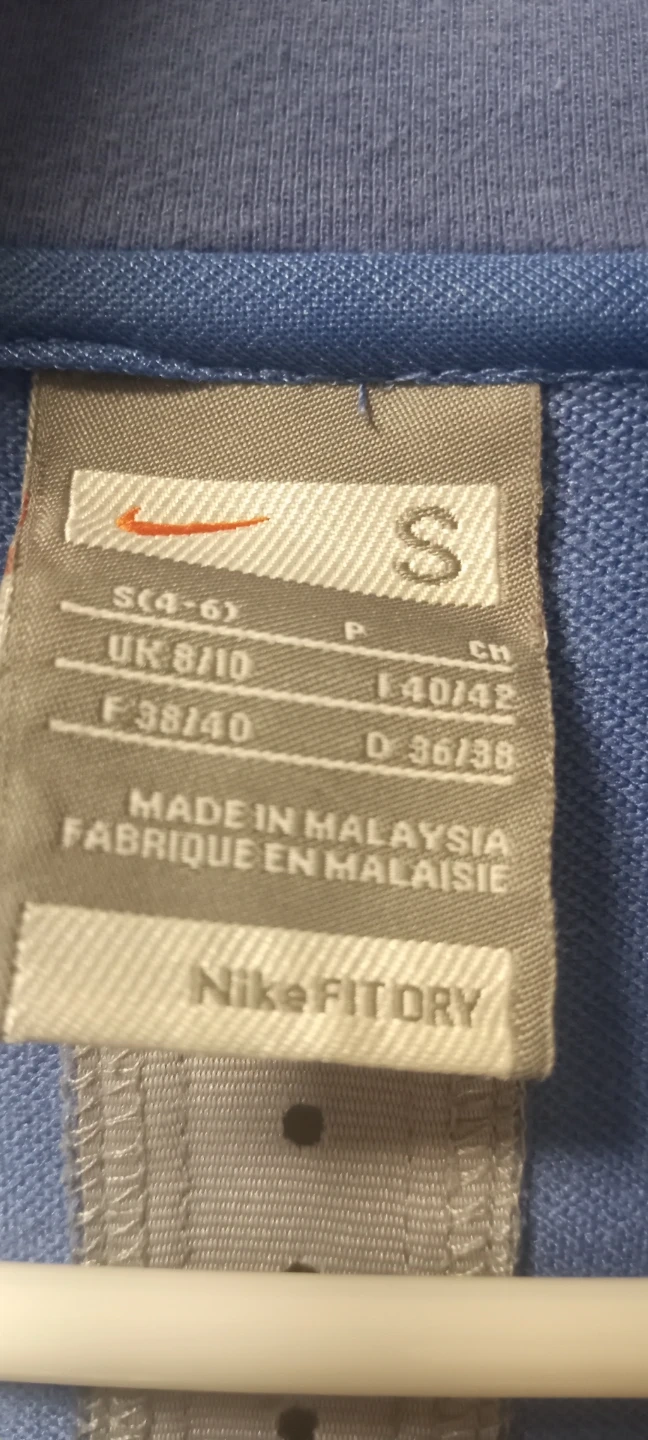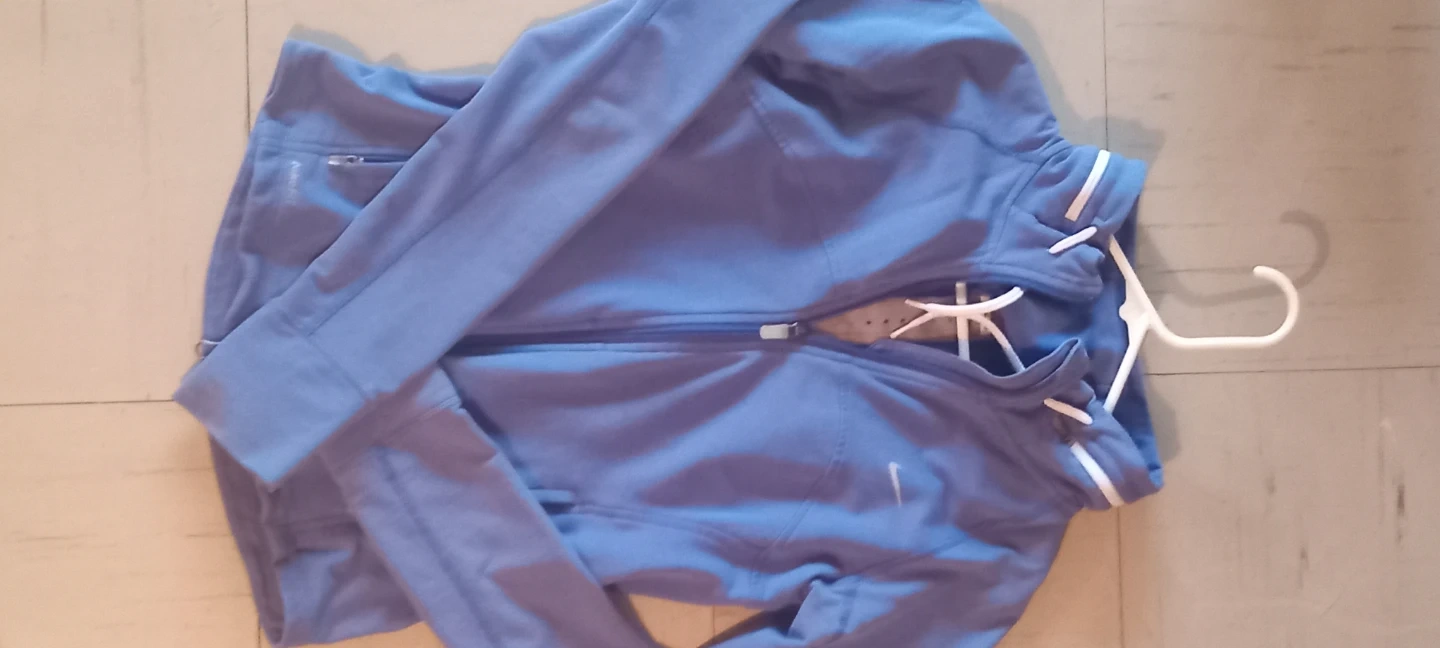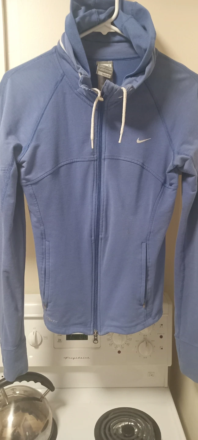 This blue Nike Fit Dry zip-up is a size small. It's made in Malaysia. Features white drawstrings and white trim along the collar and cuffs.
