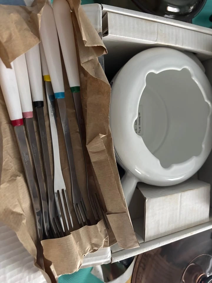 Brand new in box, never used vintage Le Creuset enameled cast iron Fondue set with 6 forks. Pick up in Keswick. Willing to deliver anywhere in Georgina, Newmarket and Aurora.