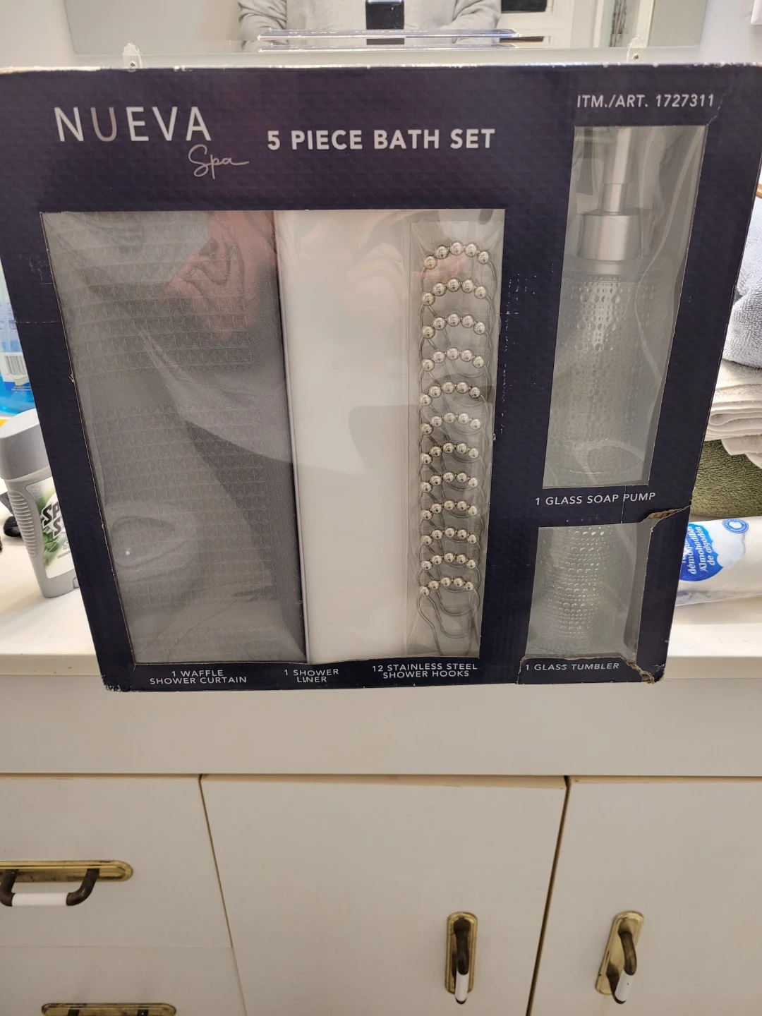 This 5 piece bath set includes a waffle textured shower curtain (70" x 72"), a white shower liner (70" x 72"), 12 stainless steel shower hooks, a glass soap pump, and a glass tumbler. Curtain made from 60% polyester and shower liner is 100% PEVA.