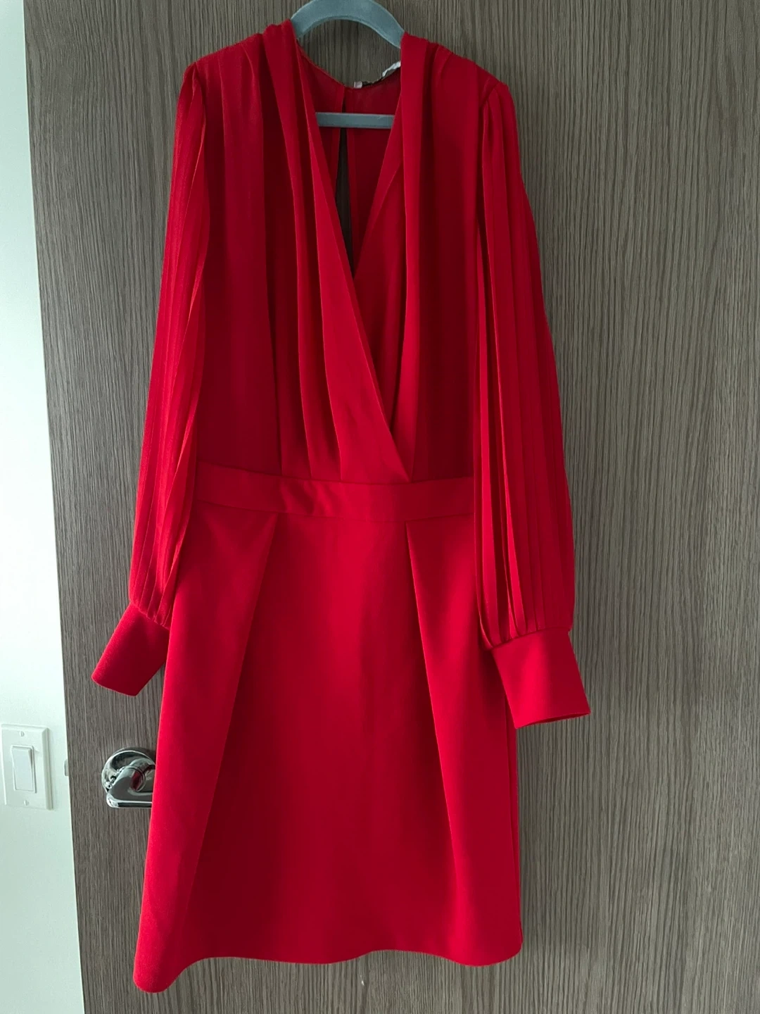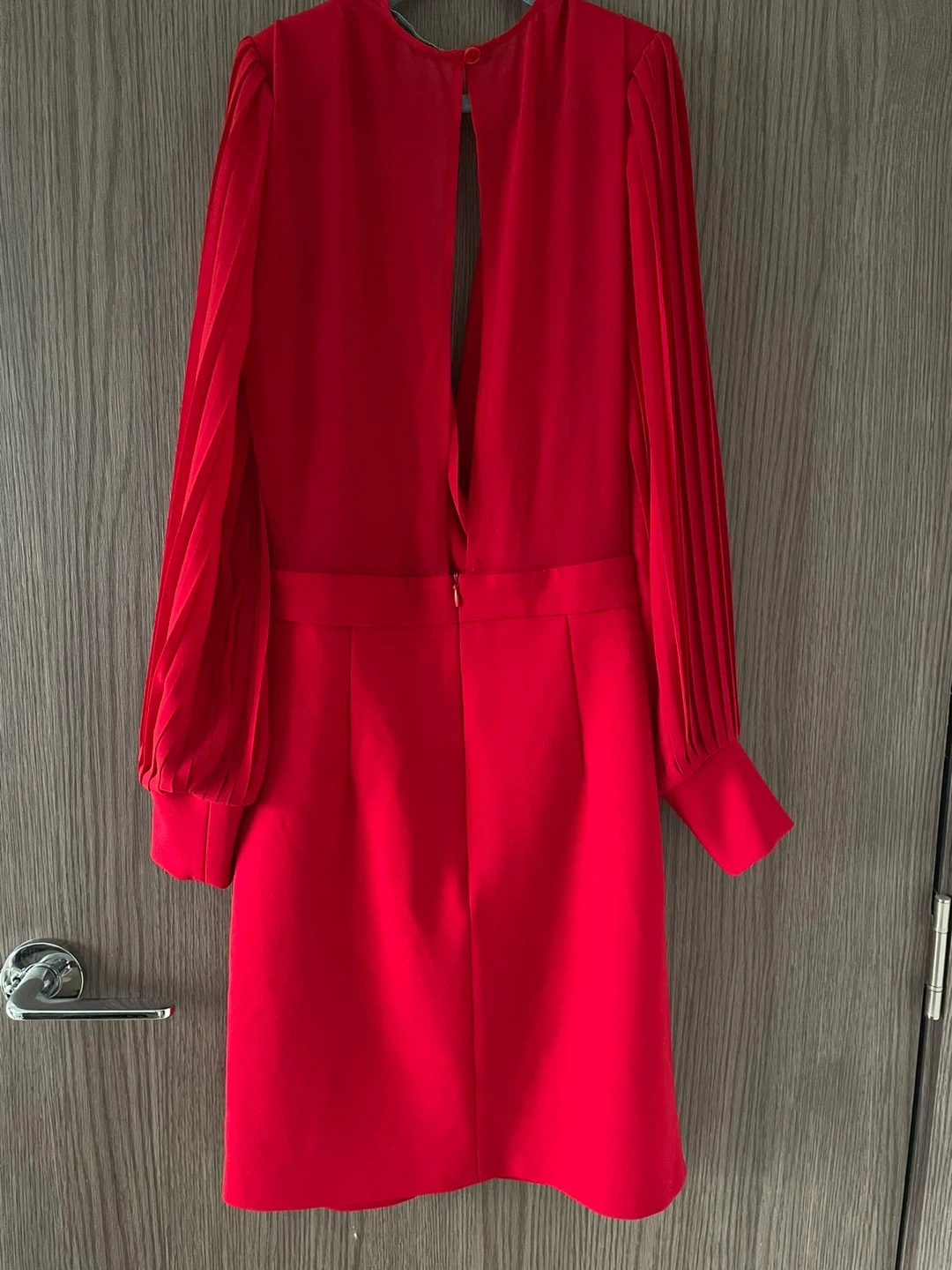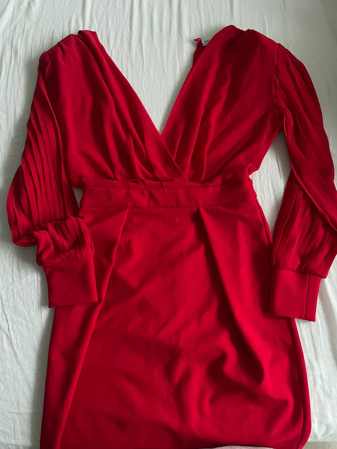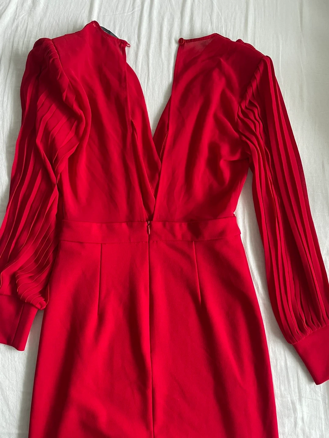A striking red mini dress with elegant pleated long sleeves and a V-neckline and V-cut back. It features a flattering fitted waist and a fitted skirt. This dress is perfect for evening events, dates or a night out!