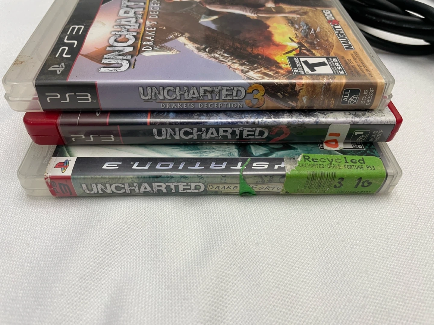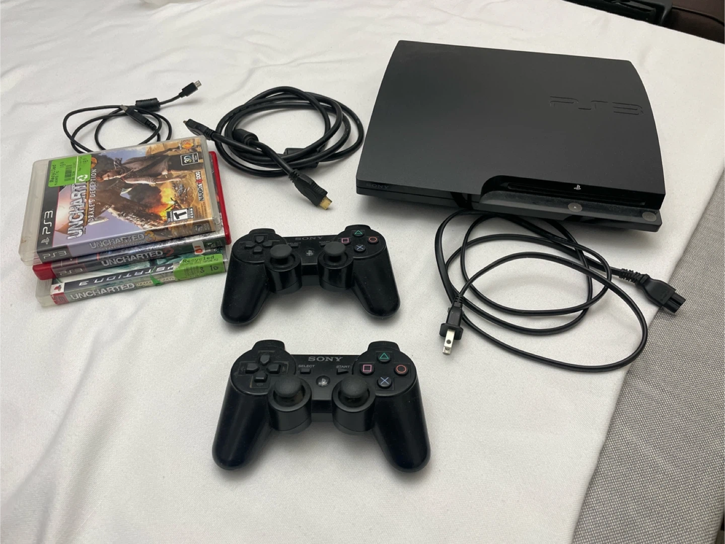 This bundle includes a Sony PlayStation 3 console, two black DualShock 3 controllers, and four Uncharted games. It comes with all necessary power and HDMI cables. It's ready for some gaming fun!