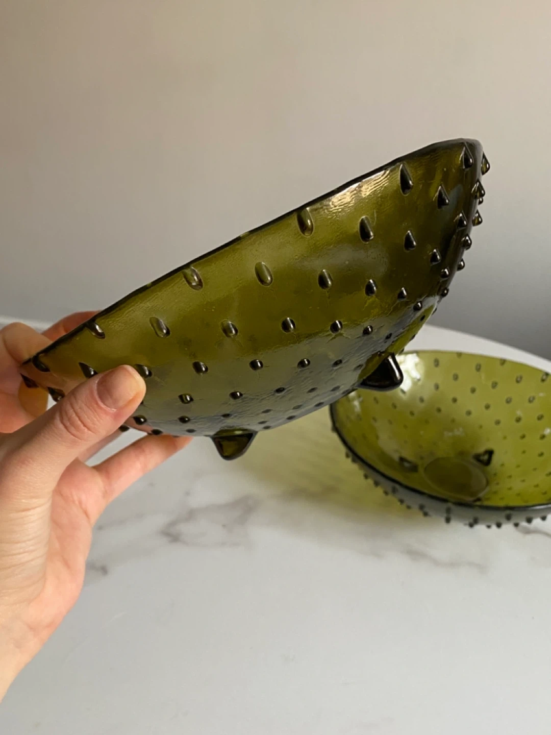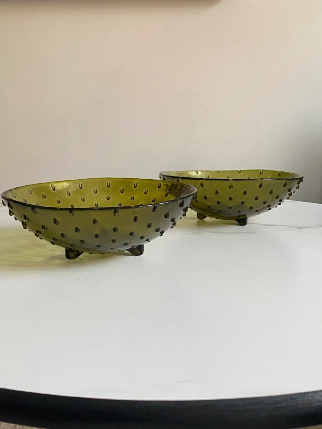 Price is for one bowl. Both bowls for $40. Textured olive green glass bowl features a hobnail design from the 1960-1970s and three small feet. These bowls are perfect for serving snacks or holding small items. Glass material in great condition.