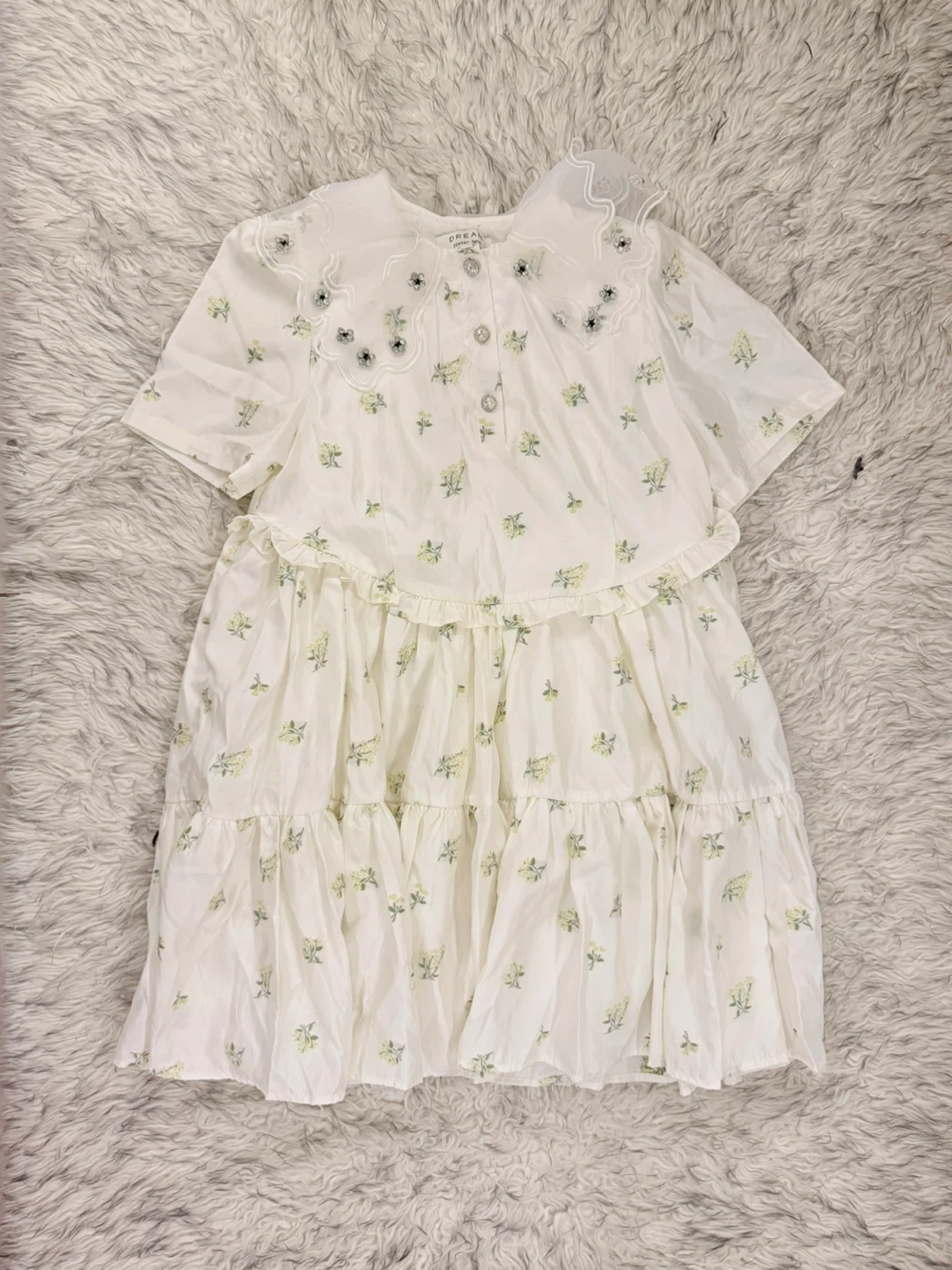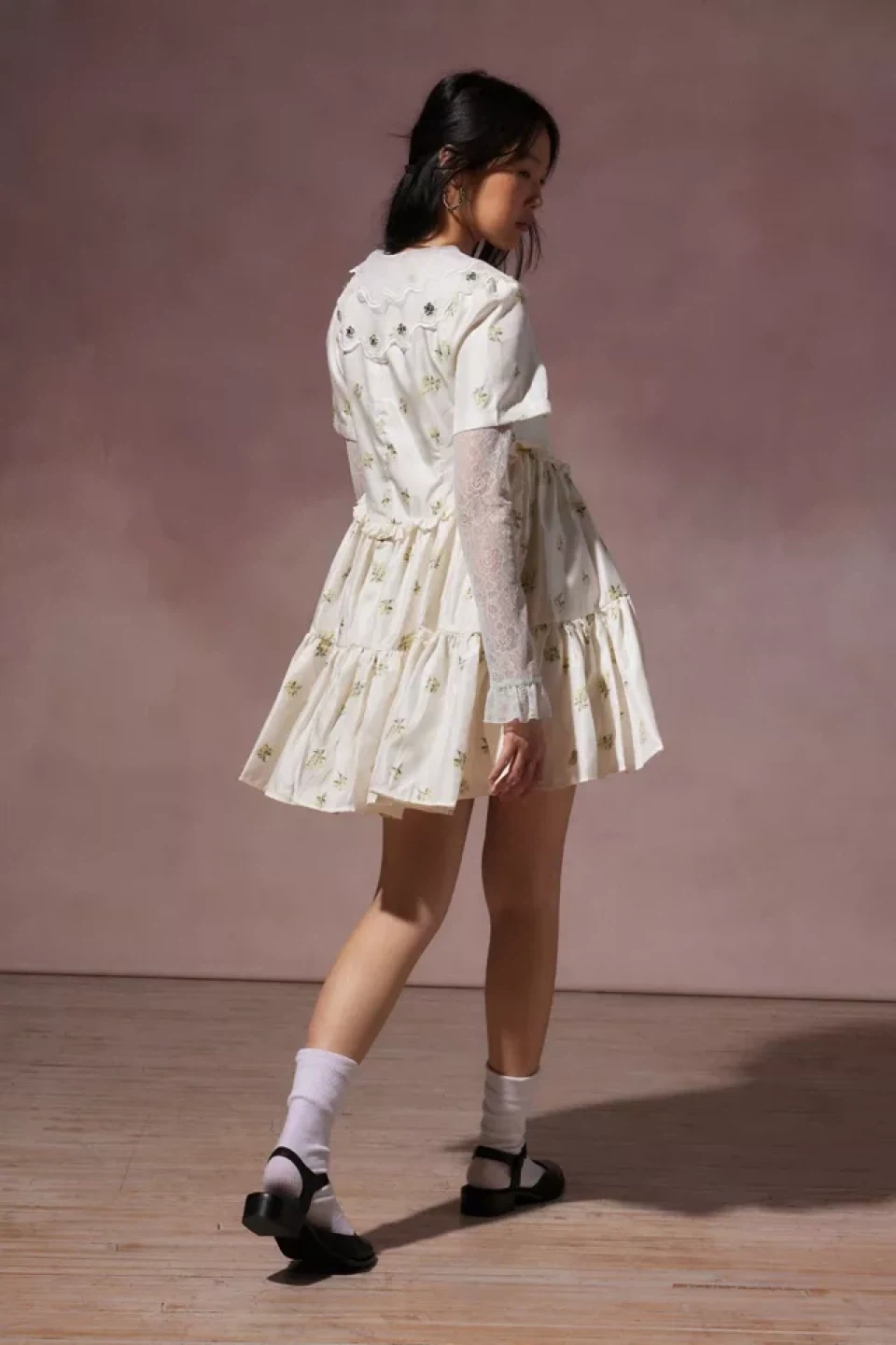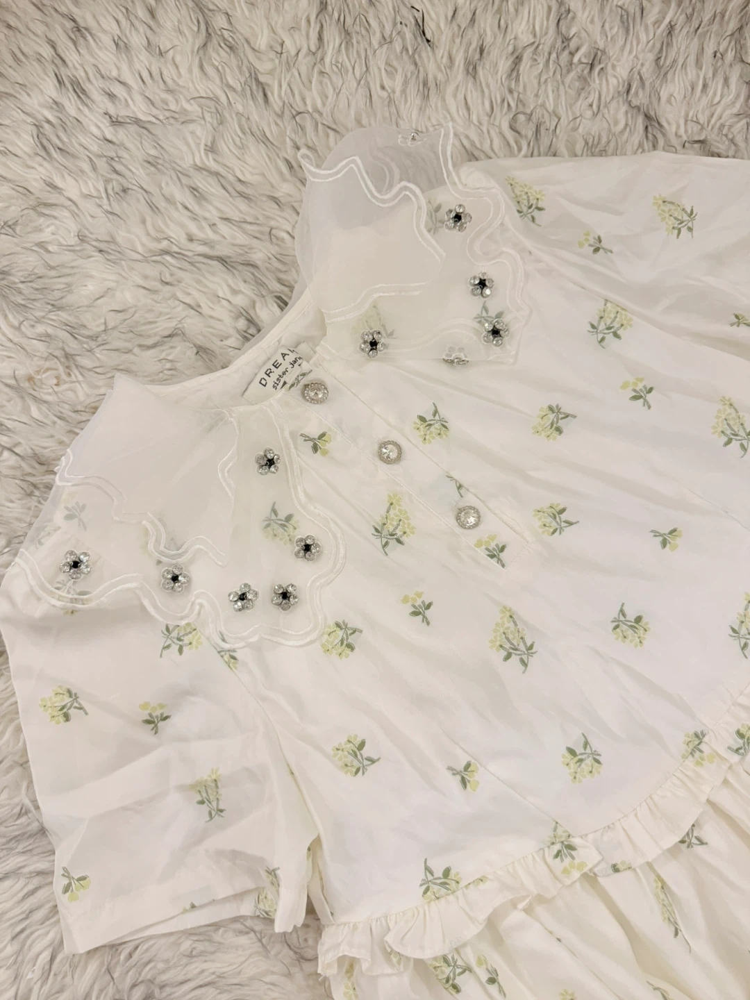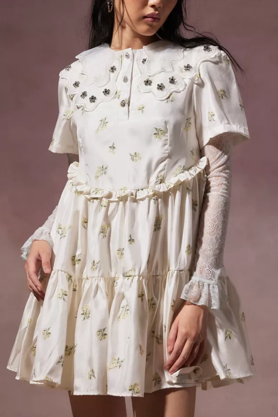 Mini dress from Sister Jane in a satiny fabric with a floral print. Cut short with a crew neckline + a mini button placket at the front and a tiered mini skirt. Complete with a layered collar adorned with gemstone flowers.