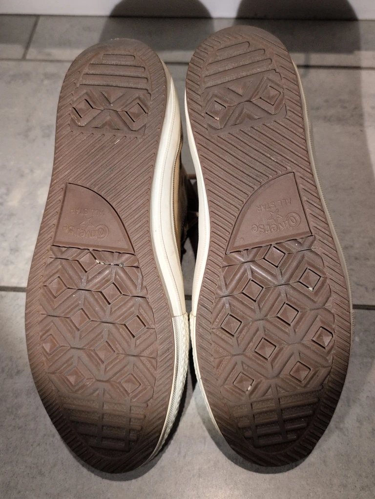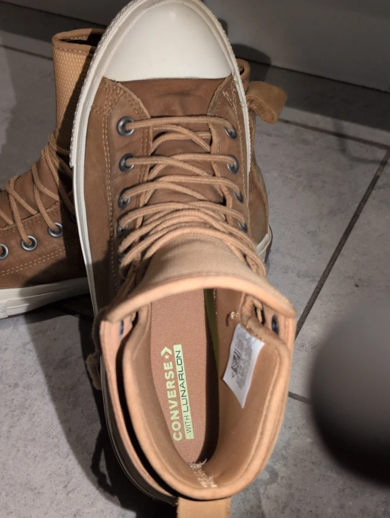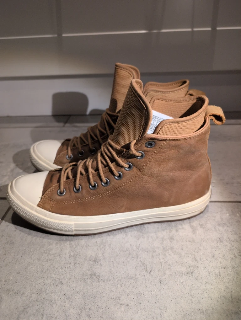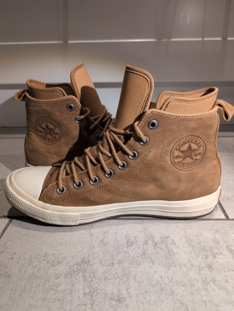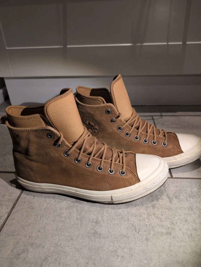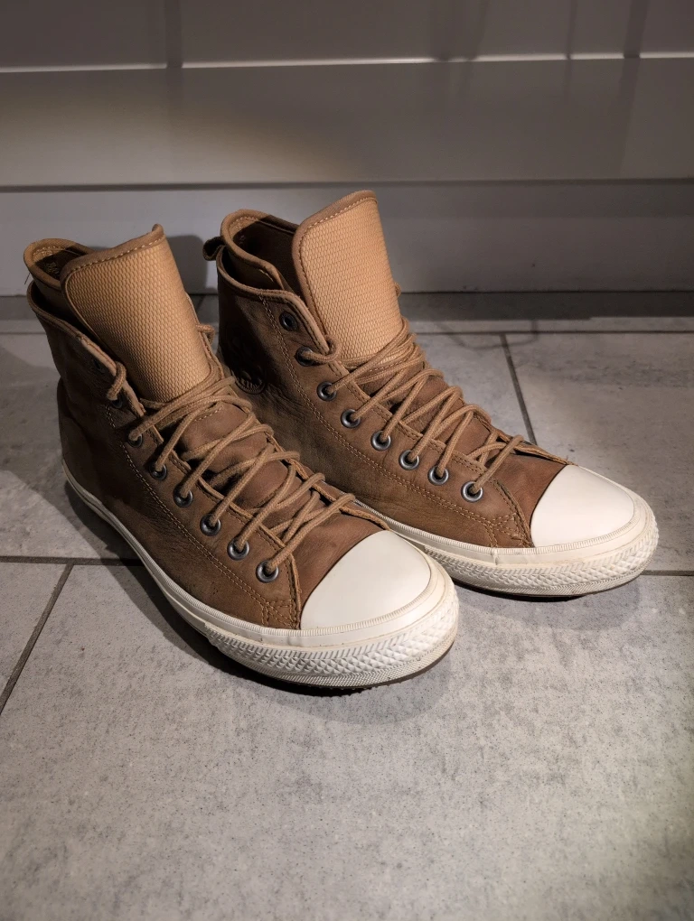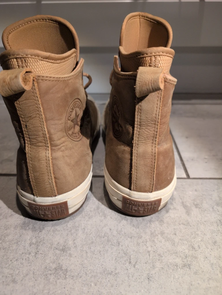Selling a pair of Converse All Star high top sneakers in a nice brown (raw sugar) leather (nubuck)! They're in great shape and ready for a new home. A stylish and comfortable option for everyday wear!