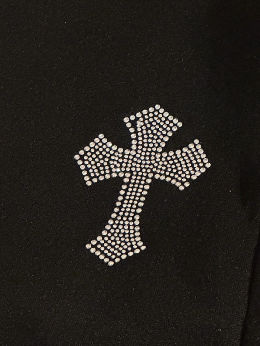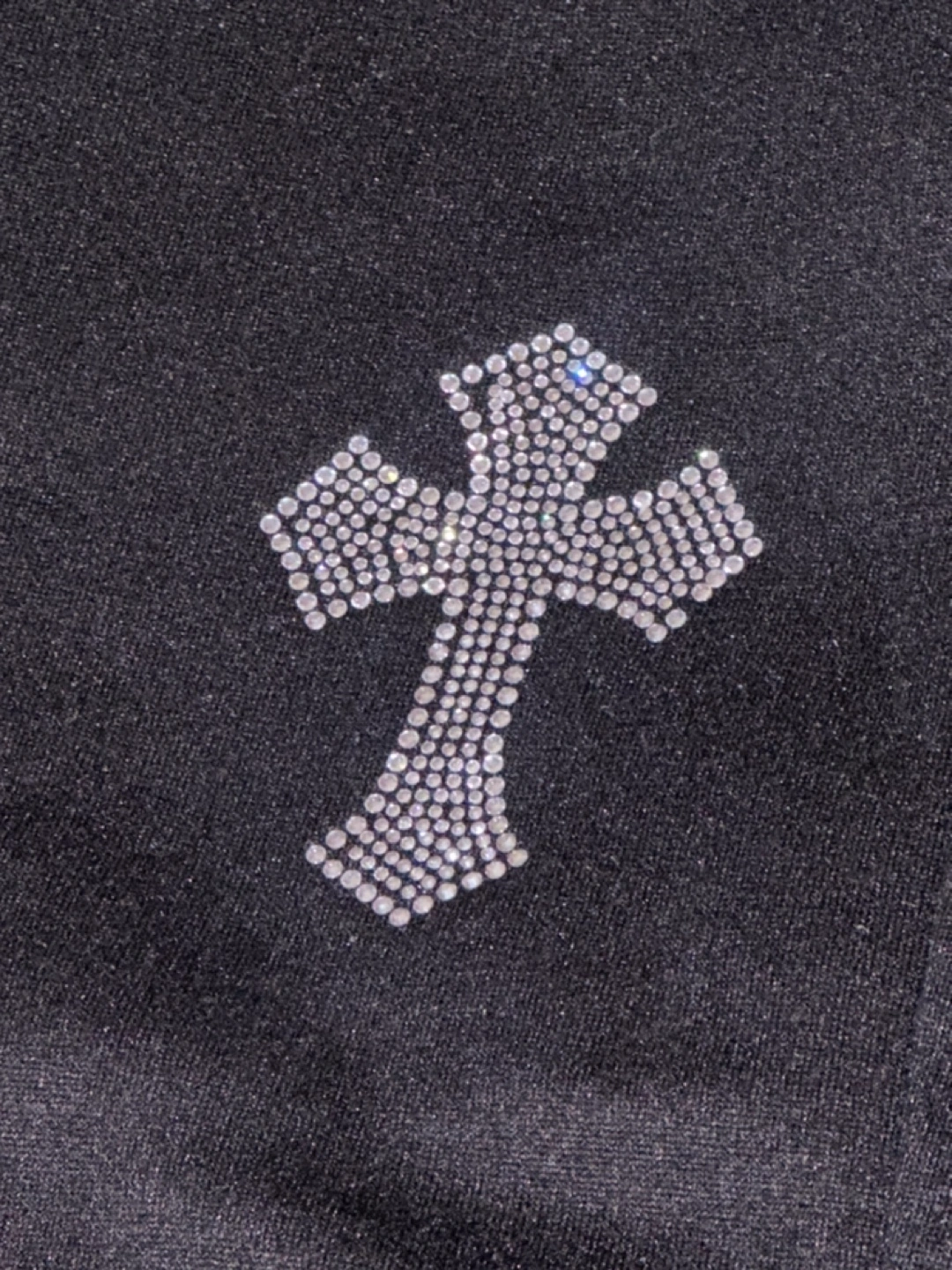 Black sweatpants. Five rhinestone crosses. Elastic waistband and cuffs. Cozy and stylish.