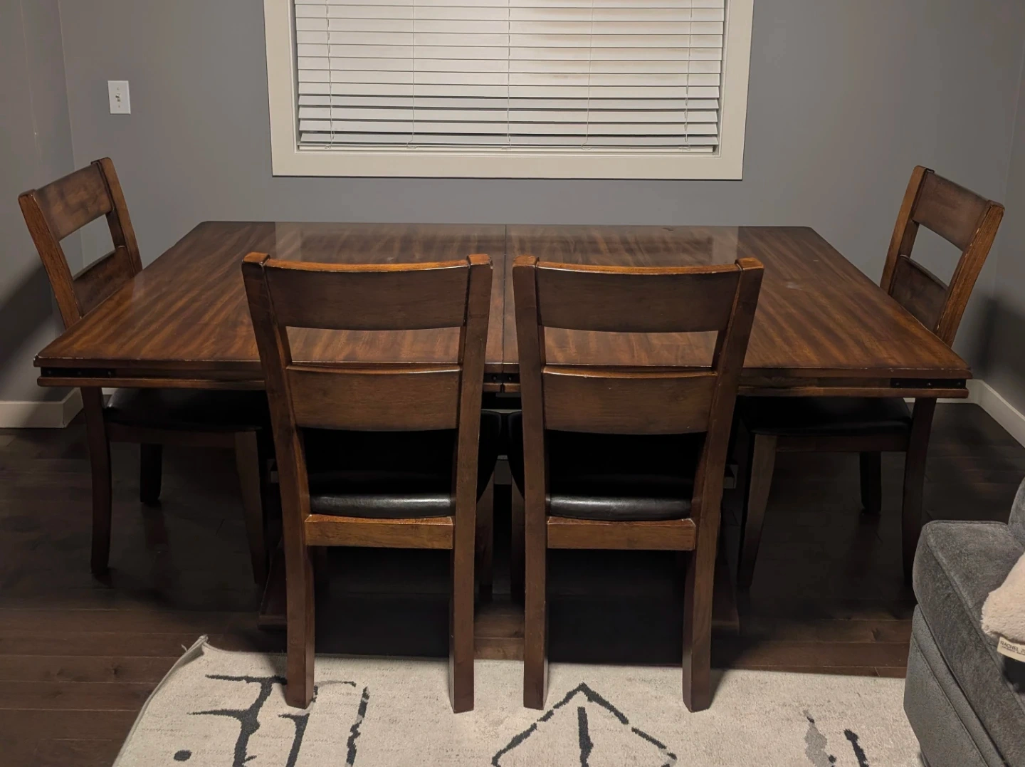 A rich brown wooden dining table with four matching chairs, each featuring upholstered black seats. This set includes one table and four chairs, large bench seating - perfect for family meals and two matching end tables. Table, chairs and end tables made of solid wood. In very good condition. A couple of faint water marks on table is the only damage.