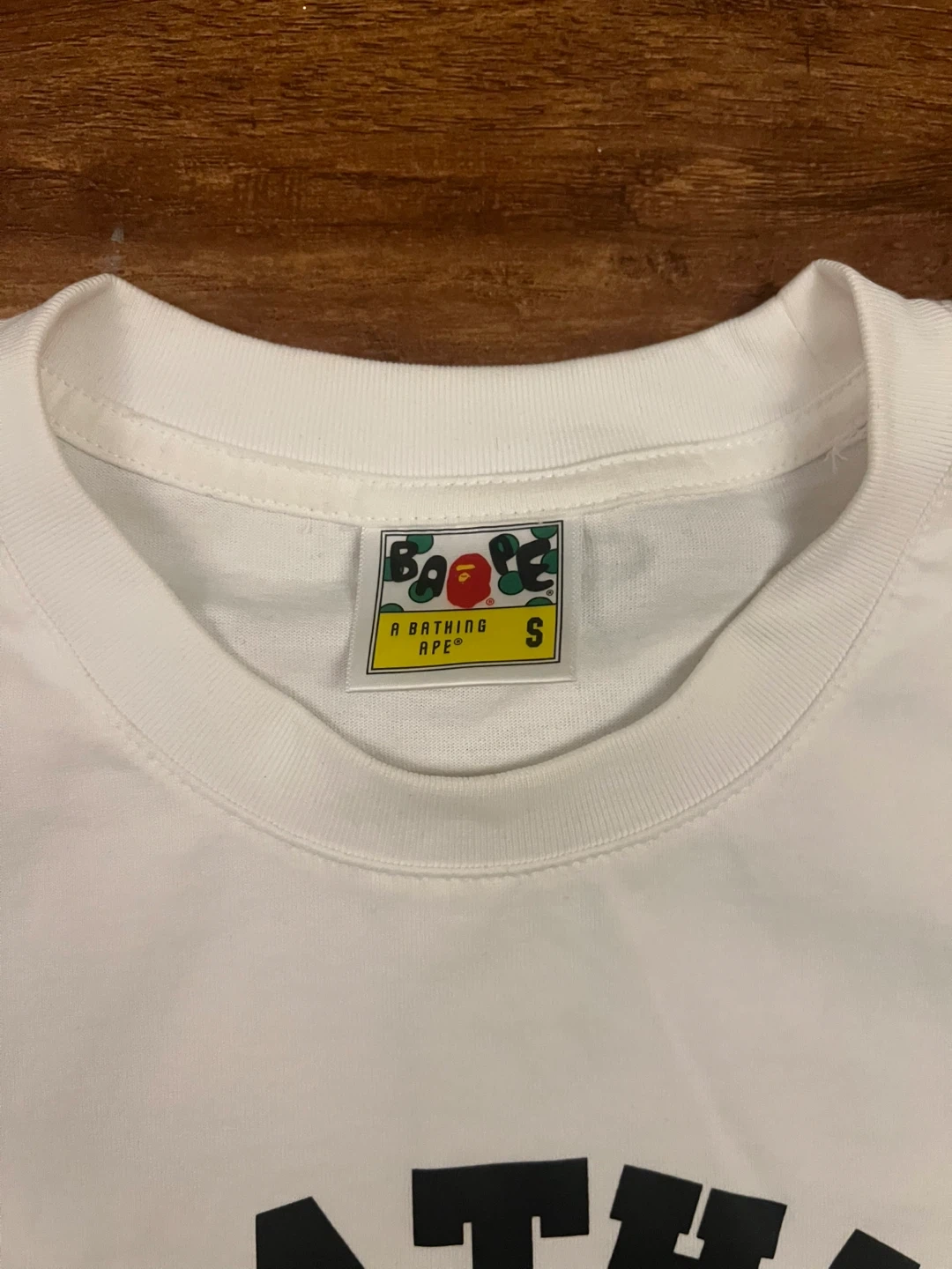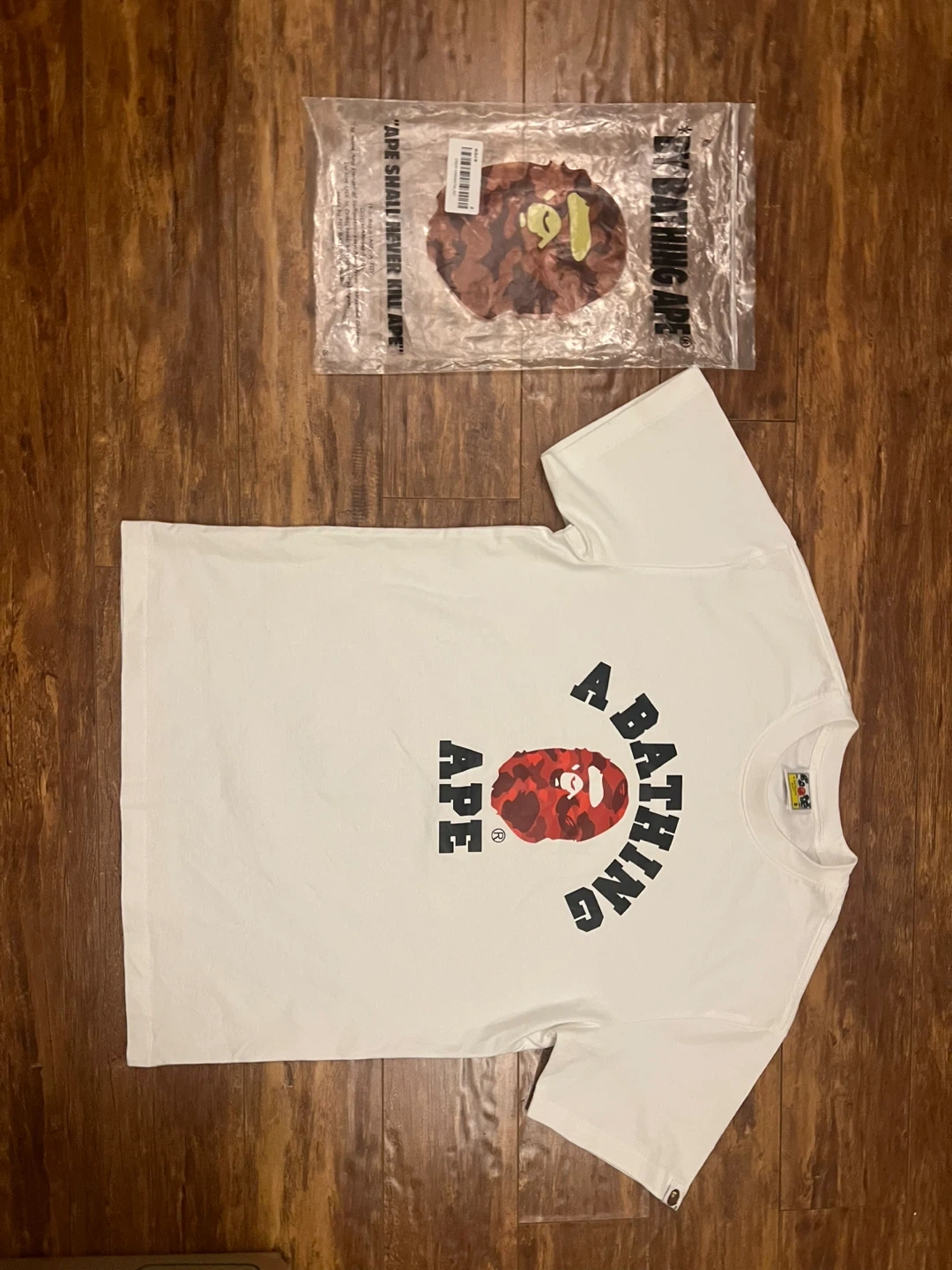 This is a white A Bathing Ape BAPE t-shirt. It's a size small. The shirt comes with its original plastic packaging.