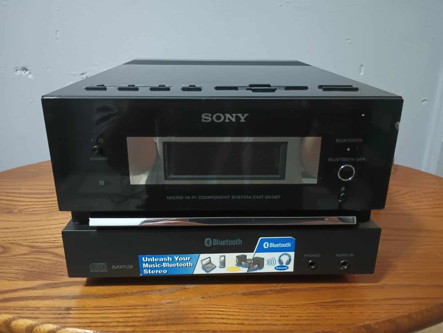 This is a Sony Micro Hi-Fi Component System, model CMT-BX5BT. It supports CD and MP3 playback. It also features Bluetooth connectivity for wireless audio streaming.